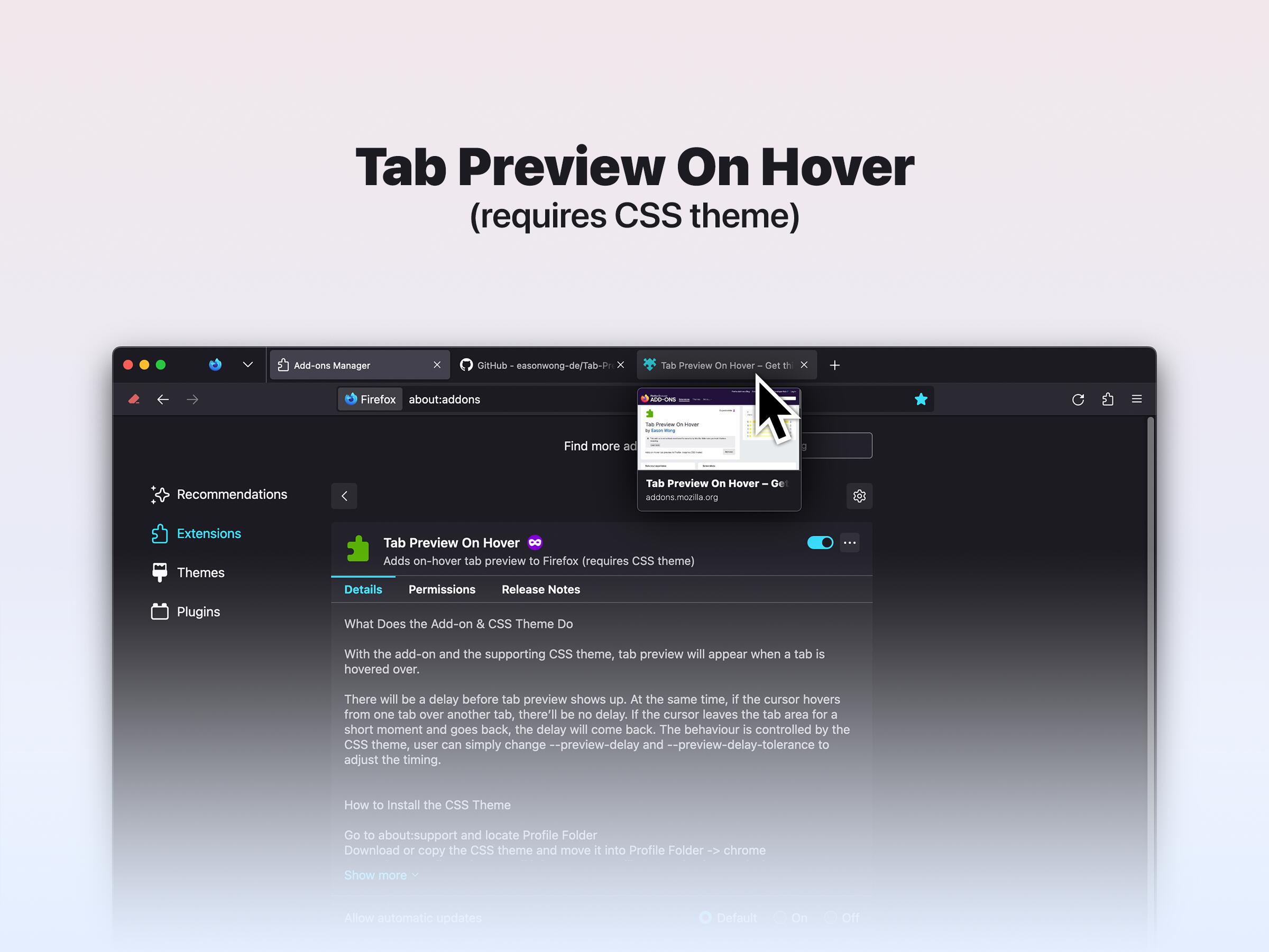 熟悉 Opera/Edge 的都知道,有一种标签页预览功能能在光标移到标签的情况下显示缩略图。现在有个大神把这个功能带进了 Firefox,这就是 Tab Preview On Hover 扩展程序。