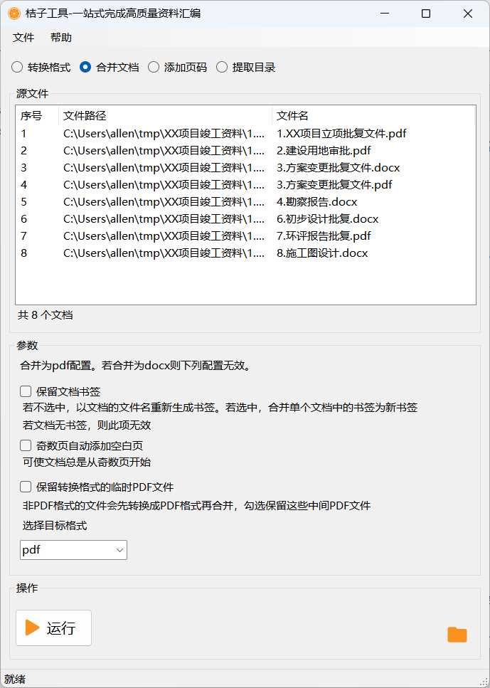 「桔子工具」是一款快速制作高质量资料汇编的工具,可以批量转换格式、合并文档、添加页码、提取目录。