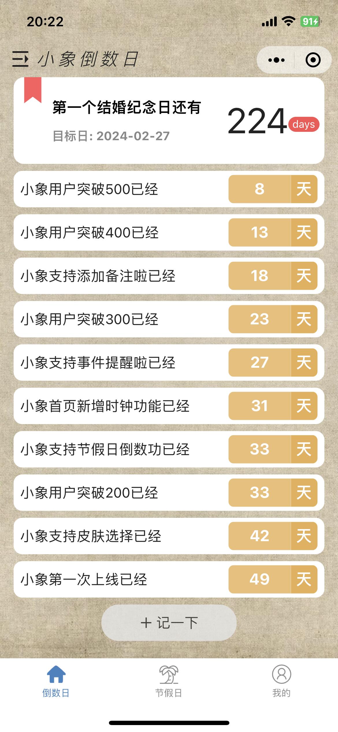 日常我们总会有一些诸如恋爱纪念日、结婚纪念日、生日、考试日等重要的日子需要记录。都说好记性不如烂笔头,那我们就需要一款工具来帮助我们记录。在此推荐一款微信小程序:小象倒数日。