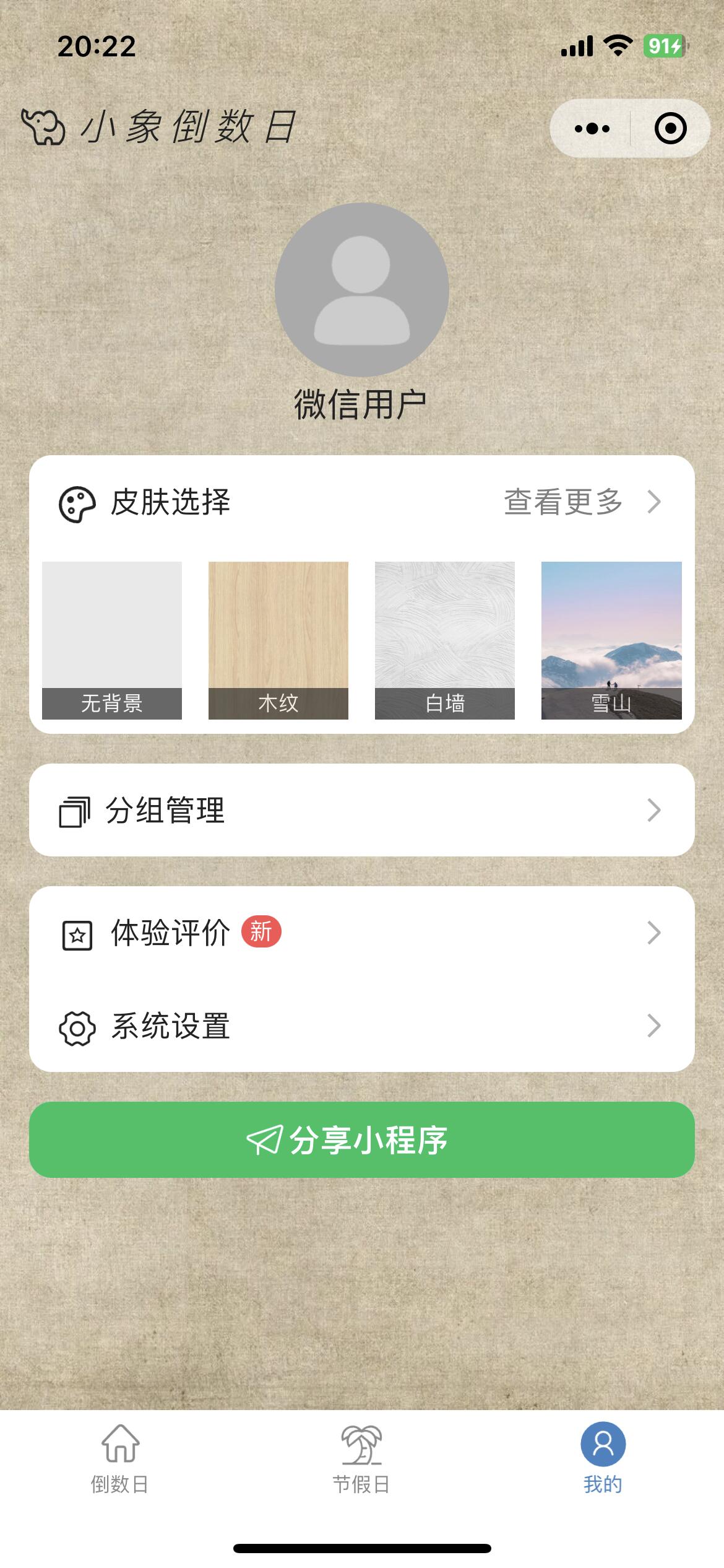 | 首页展示所有的倒数日列表,可以点击左上角打开侧边栏进行分组切换 | 感知节假日的到来,让每天都有盼头 | 编辑时可以设置提醒,避免遗忘 | 不可编辑态查看倒数日 | 在个人页可以进行皮肤选择、分享小程序、问题反馈等 |