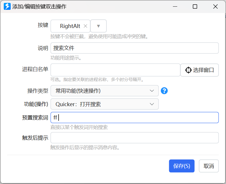 然后可以通过快捷键或双击按键触发搜索并且预先填入特定的触发词: