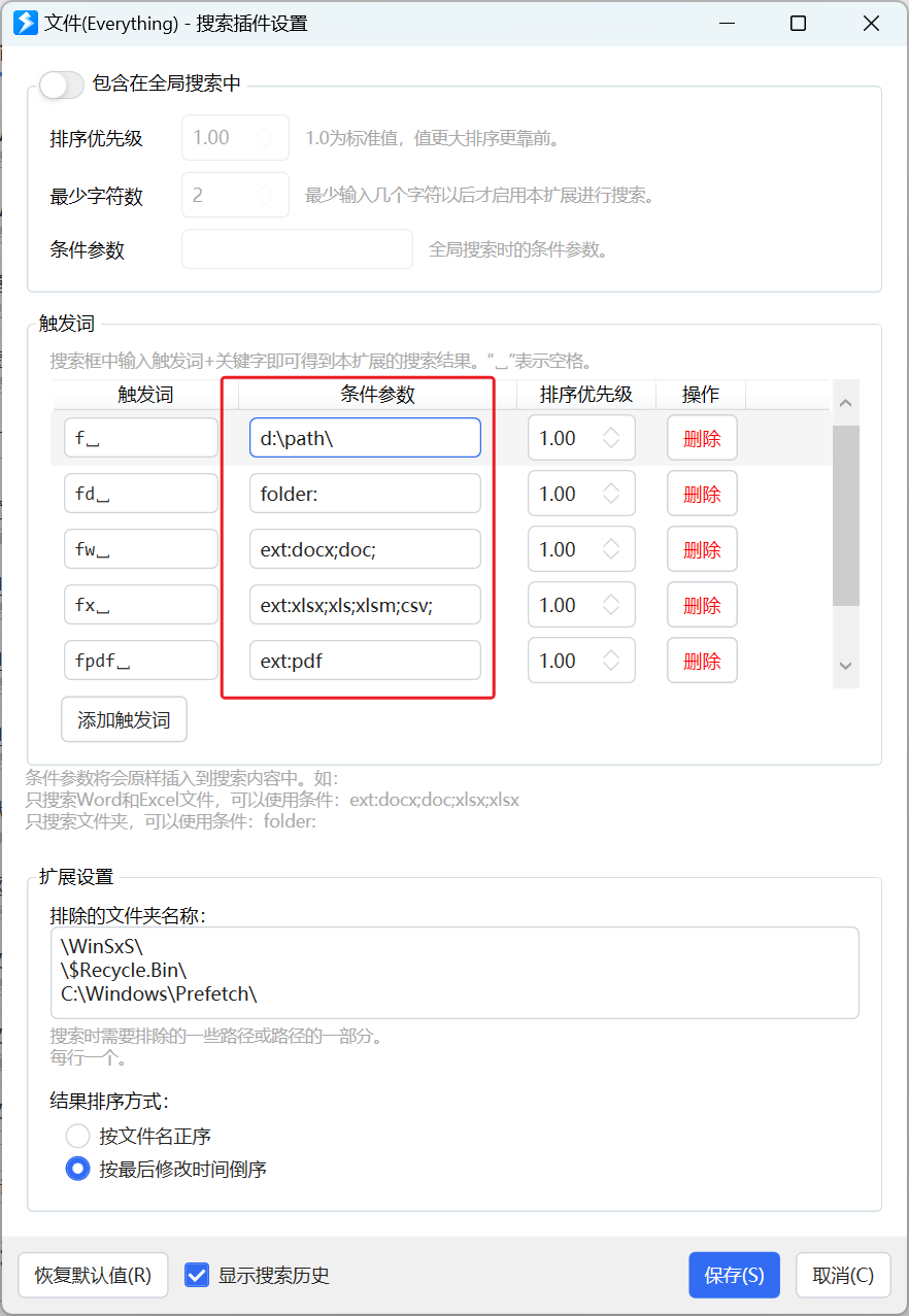 如果不需要拼音匹配,使用everything搜索插件,设置不同的触发词执行不同的搜索功能: