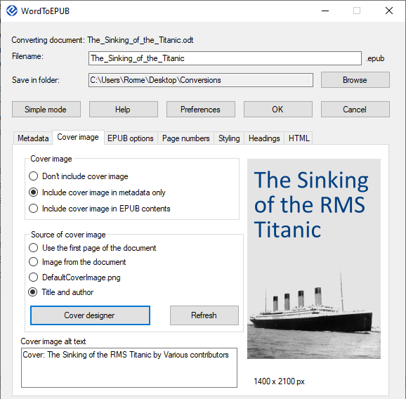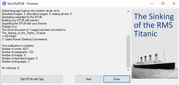 WordToEPUB 是一款专为 Microsoft Word 开发的加载项,用来将文档转换为 EPUB 电子书,可从 Word 或者文件资源管理器启动,并能配置电子书的语言、元数据、封面等。