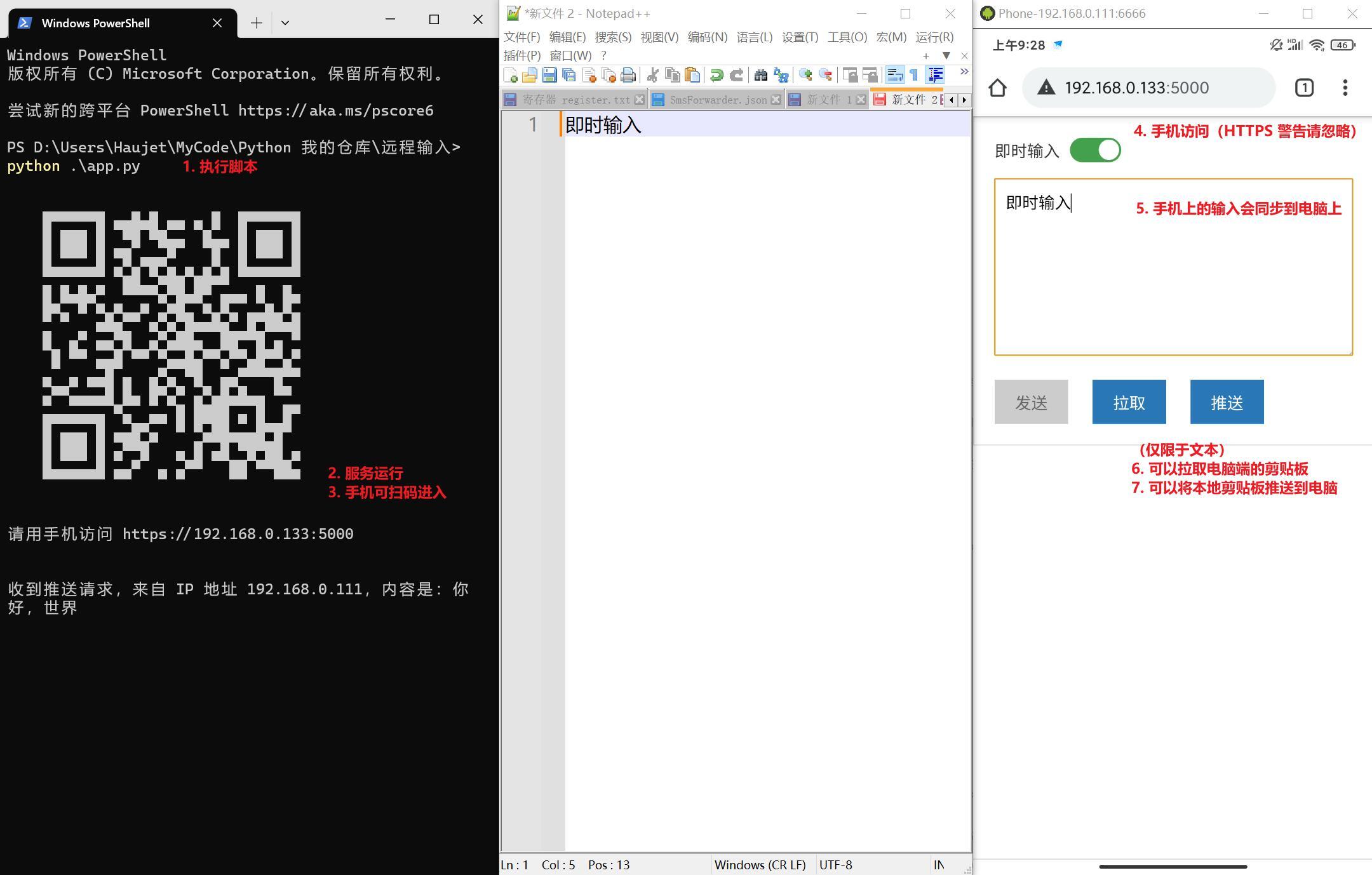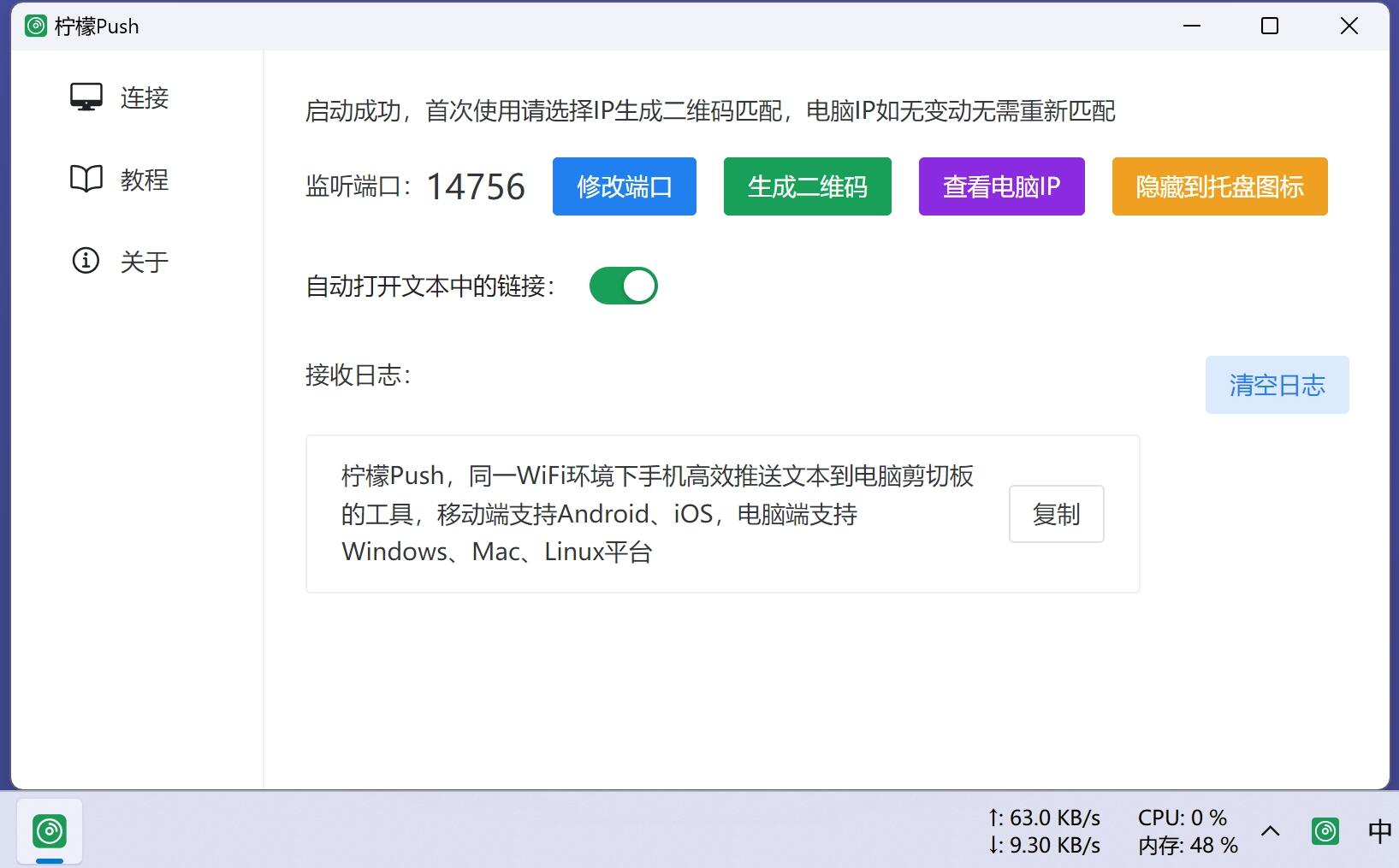 同一WiFi环境下手机高效推送文本到电脑剪切板的工具,电脑端支持Windows、Mac、Linux平台