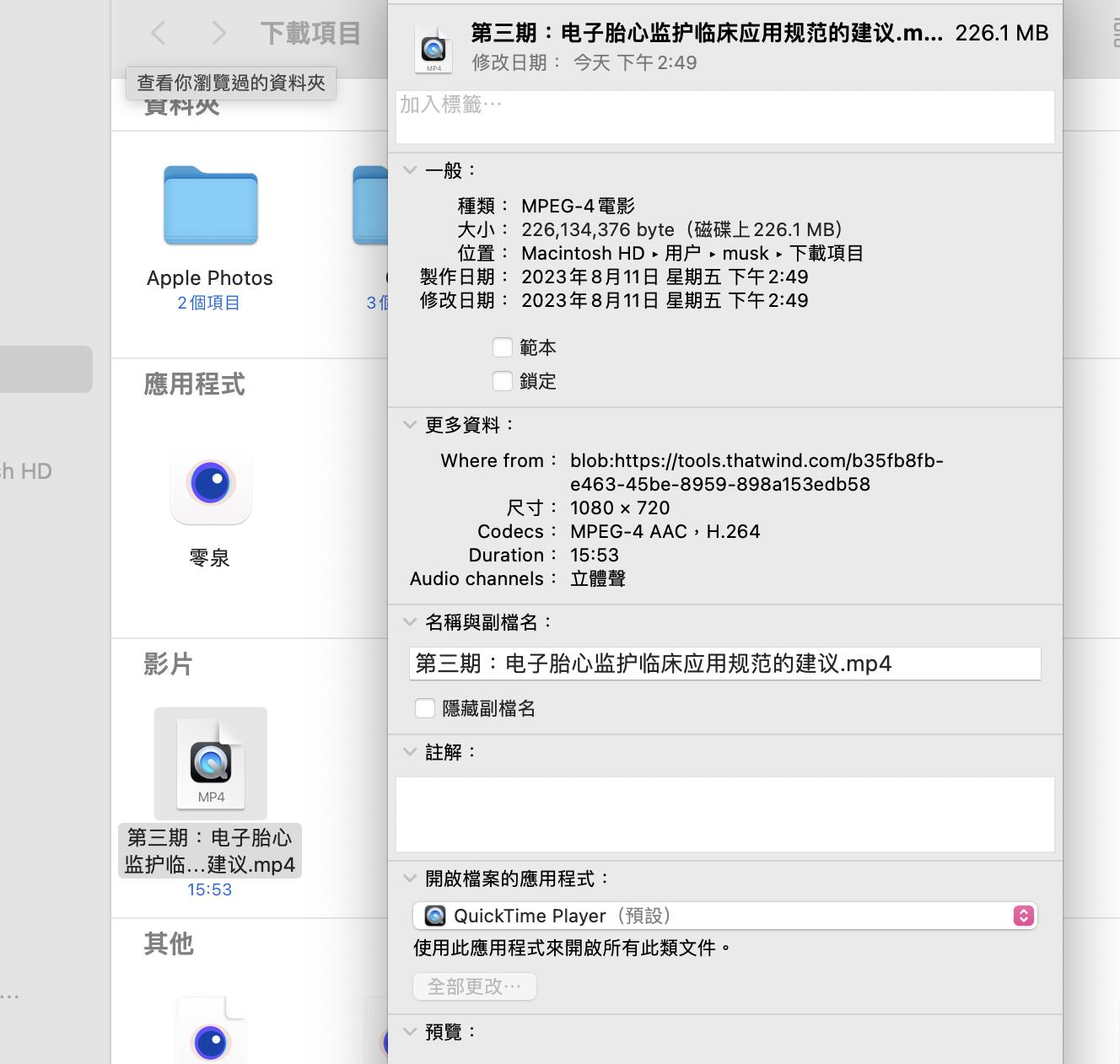 下载下来合并后是226MB(可以通过浏览器审查元素的方法Copy视频链接到网上随便一个M3U8在线在下载网站下载文件并合并成MP4文件)