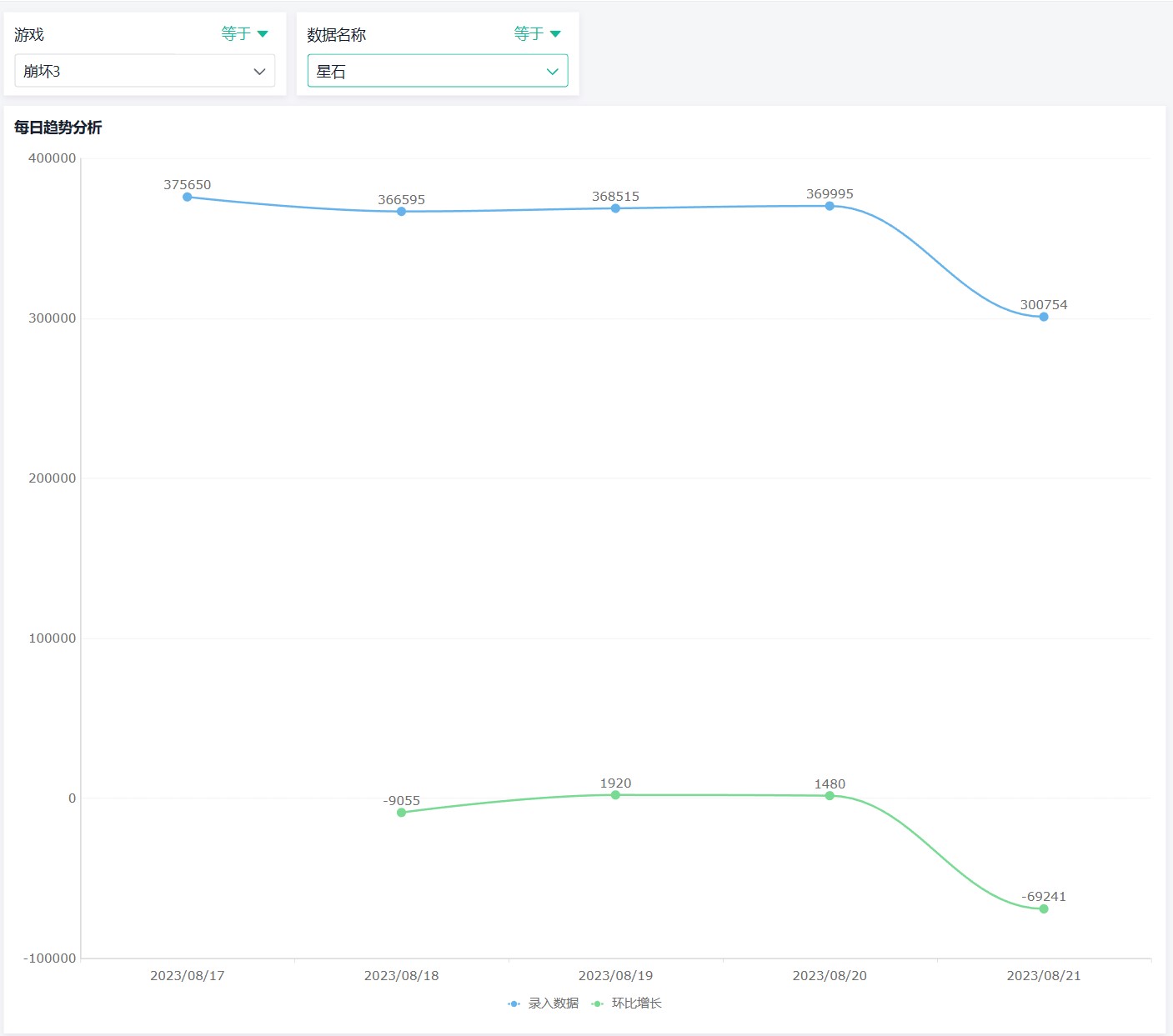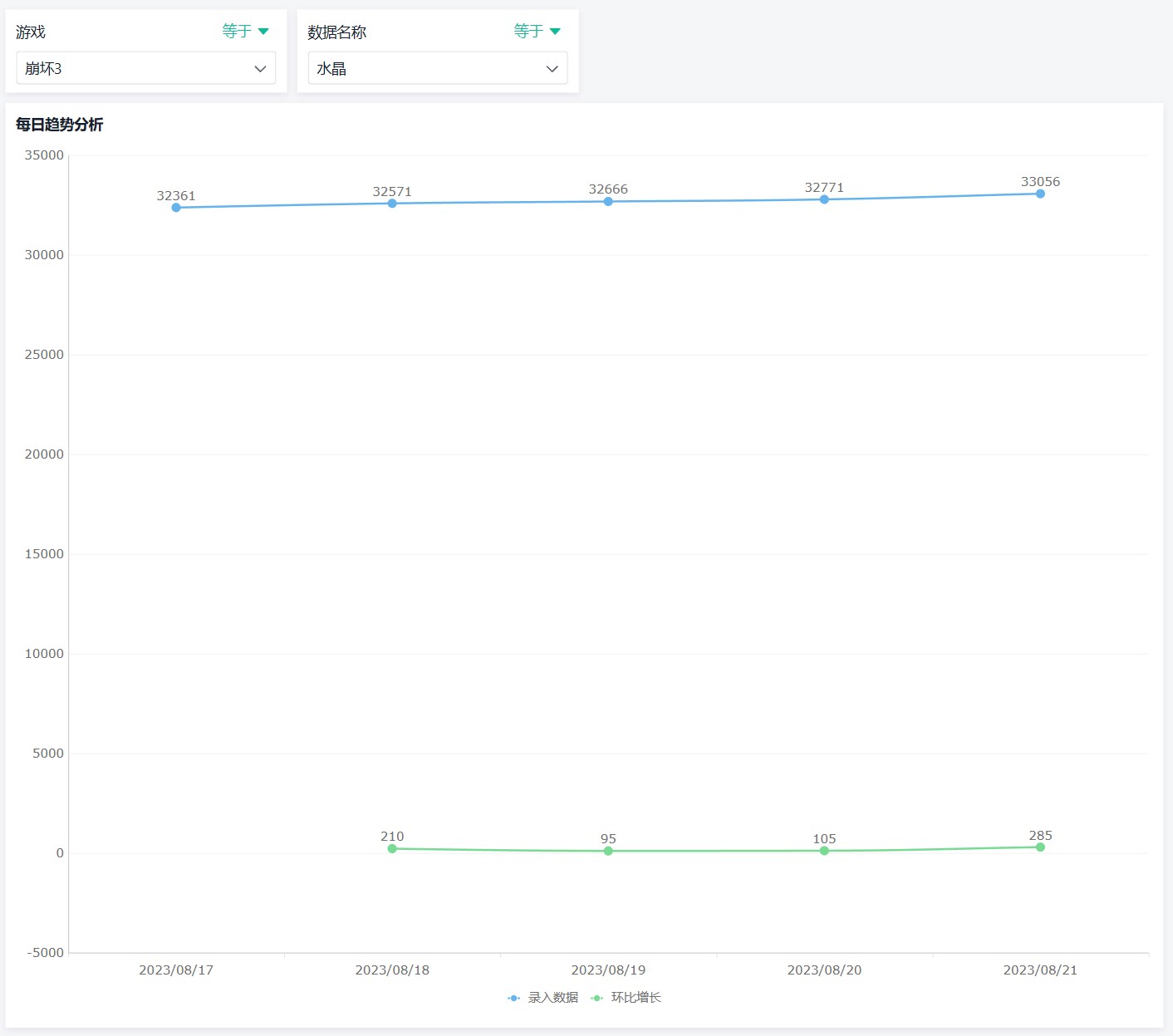 主要是是用来跟踪游戏数据的,手动录入即可,至少需要图表可视化展示(如折线图),数据增加\消耗趋势
