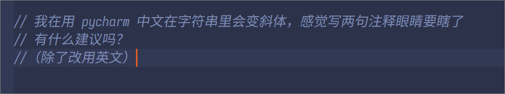 我在用pycharm 中文在字符串里会变斜体,感觉写两句注释眼睛要瞎了 有什么建议吗? (除了改用英文)