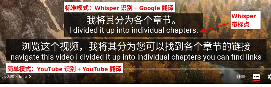 就跟 YouTube 的“自动生成”字幕一样,但是带有标点符号,字幕整句显示,和画面声音没有延迟,机器翻译也是联系上下文的。(备注:有延迟也是 Whsiper 的打轴错误)