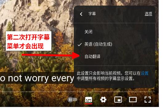 - 再打开一次字幕菜单,会多了个“自动翻译”菜单条目。