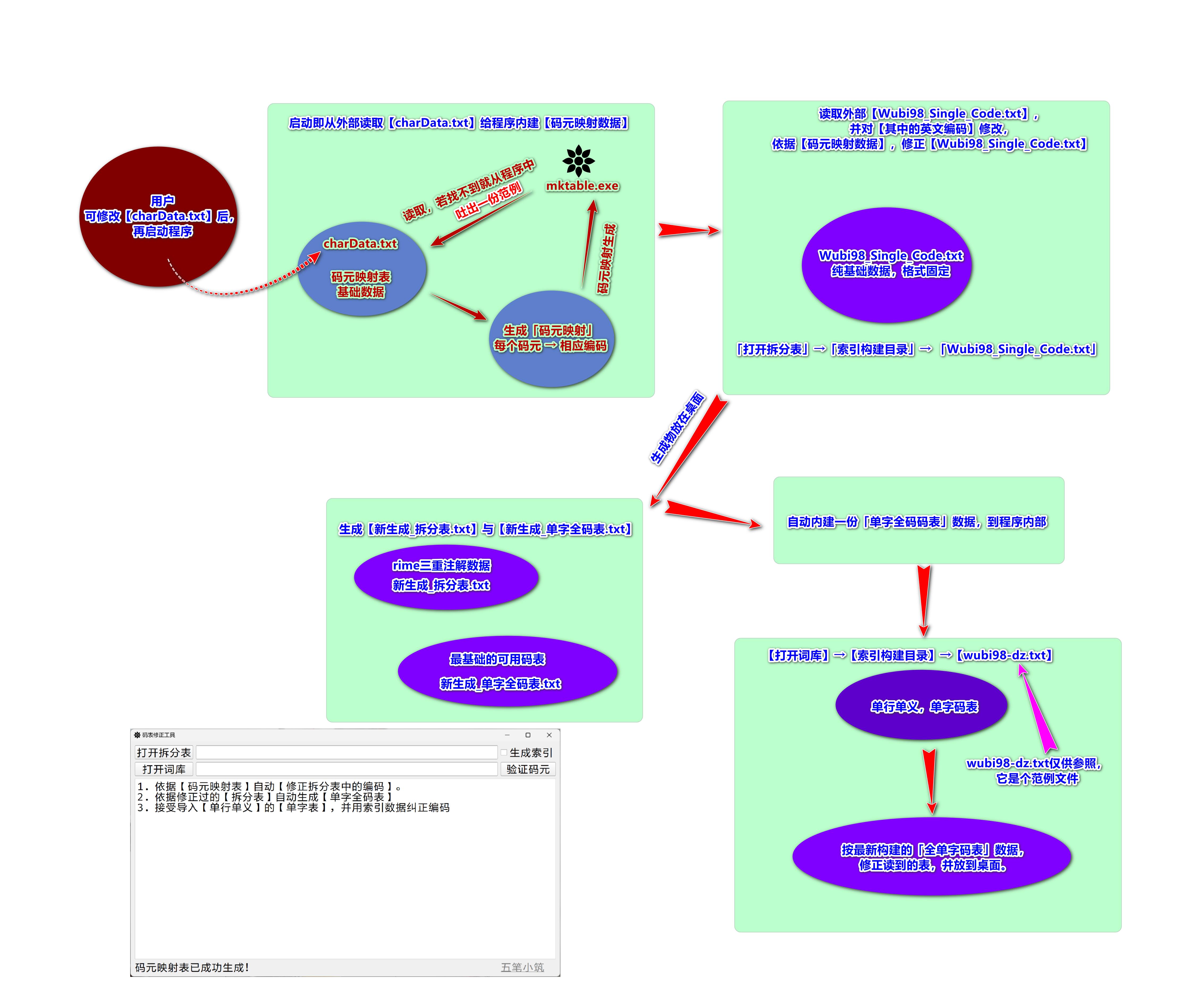 当你有一个拆分蓝本时,用它能迅速生成码表,而且允许你反复测试修改某个字根布局(键位)后对全局的影响。