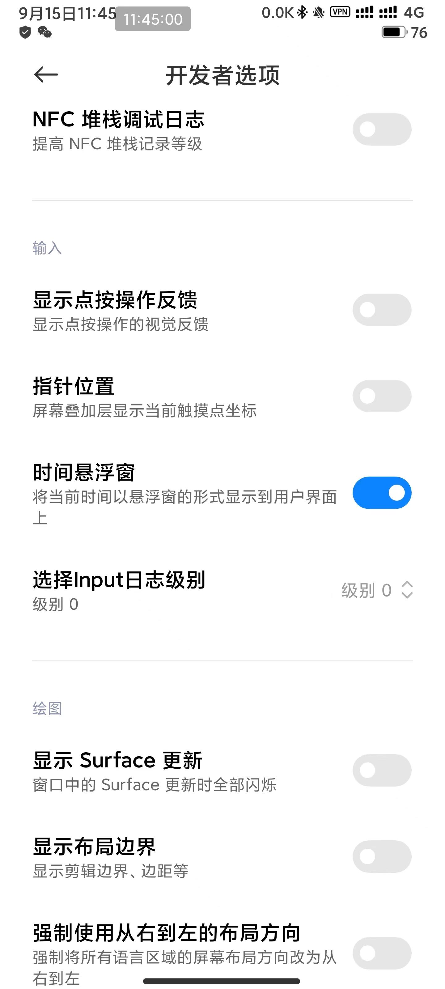刚刚在开发者选项里发现,直接就有时间悬浮窗这个功能,看图片灰色框框就是了。
