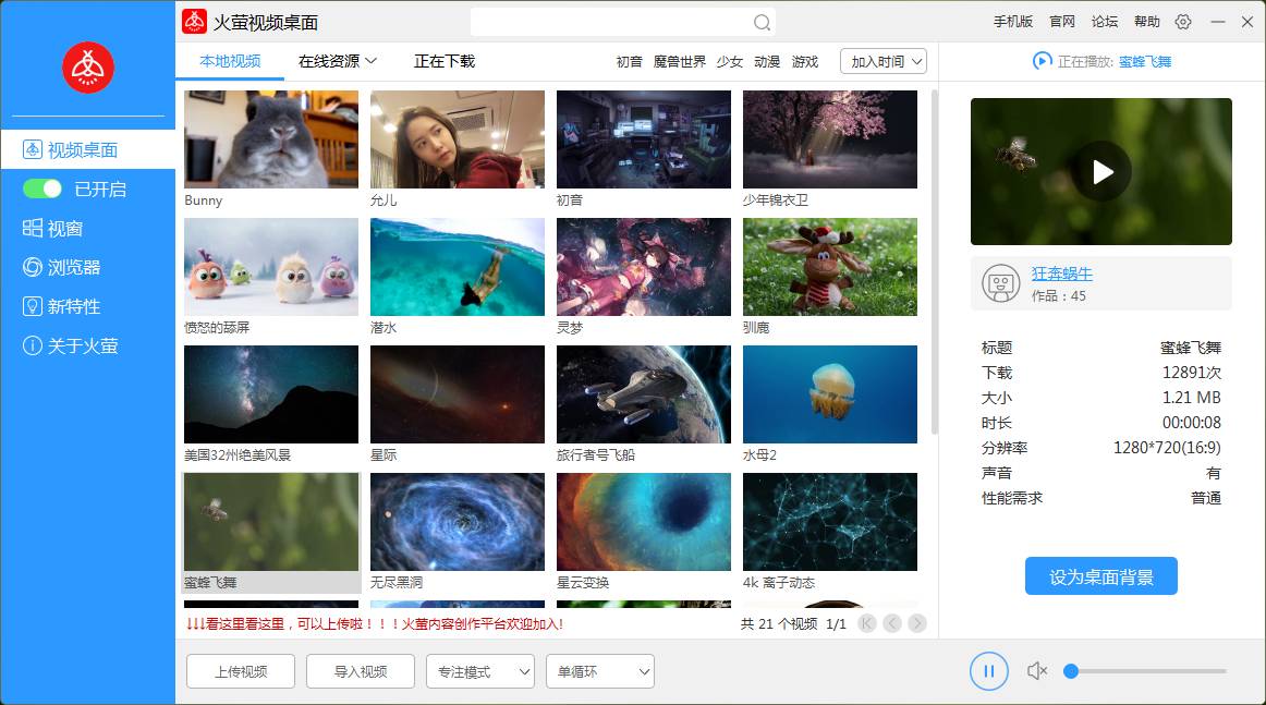 应用视频桌面这个操作起来很方便,只要打开火萤,选择“设置为背景”,或者直接在视频缩略图双击,就完成了设置