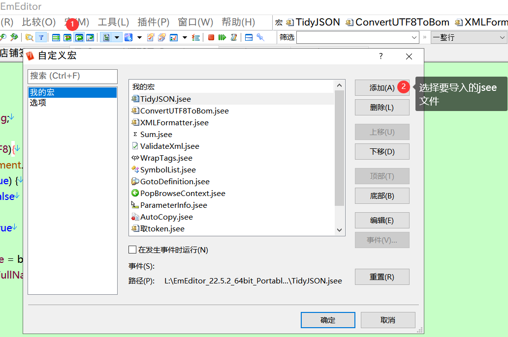 依次点击菜单栏的宏-自定义-添加, 选择ConvertUtf8Bom.jsee, 点击确定, 宏就导入到EmEditor