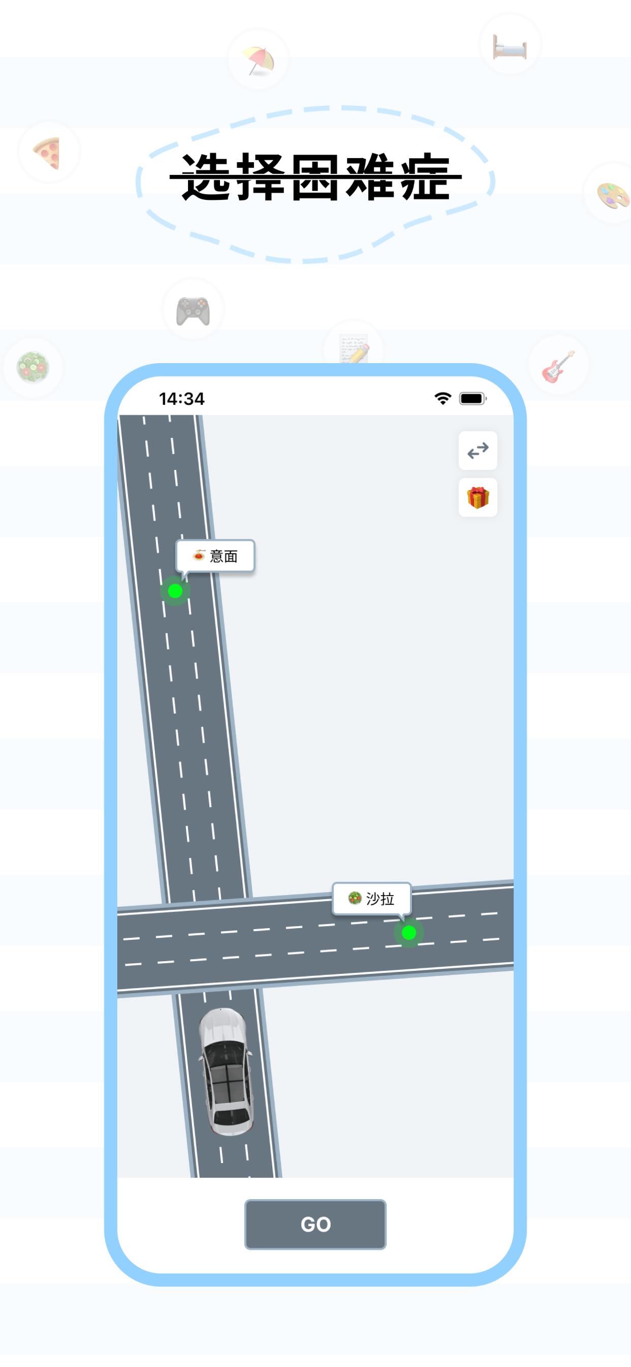 用户可以点击 “GO” 按钮,车子会从随机选择的一条路上通过,这条路上的选项就是帮助用户做出的选择。