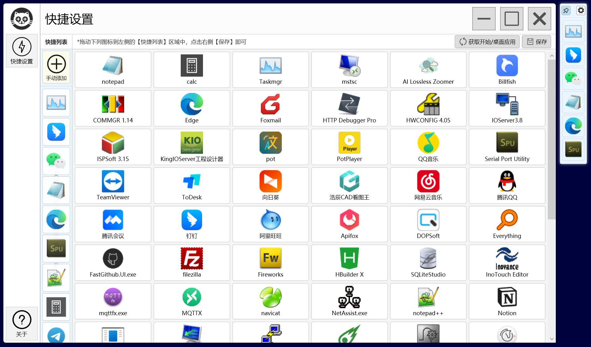 开发原因是本人不爱整理桌面,时常导致桌面文件和快捷方式混乱无序。有些时候找起程序来很费眼,故诞生了此工具。此工具主要是为了将常用软件固定位置,快捷启动。