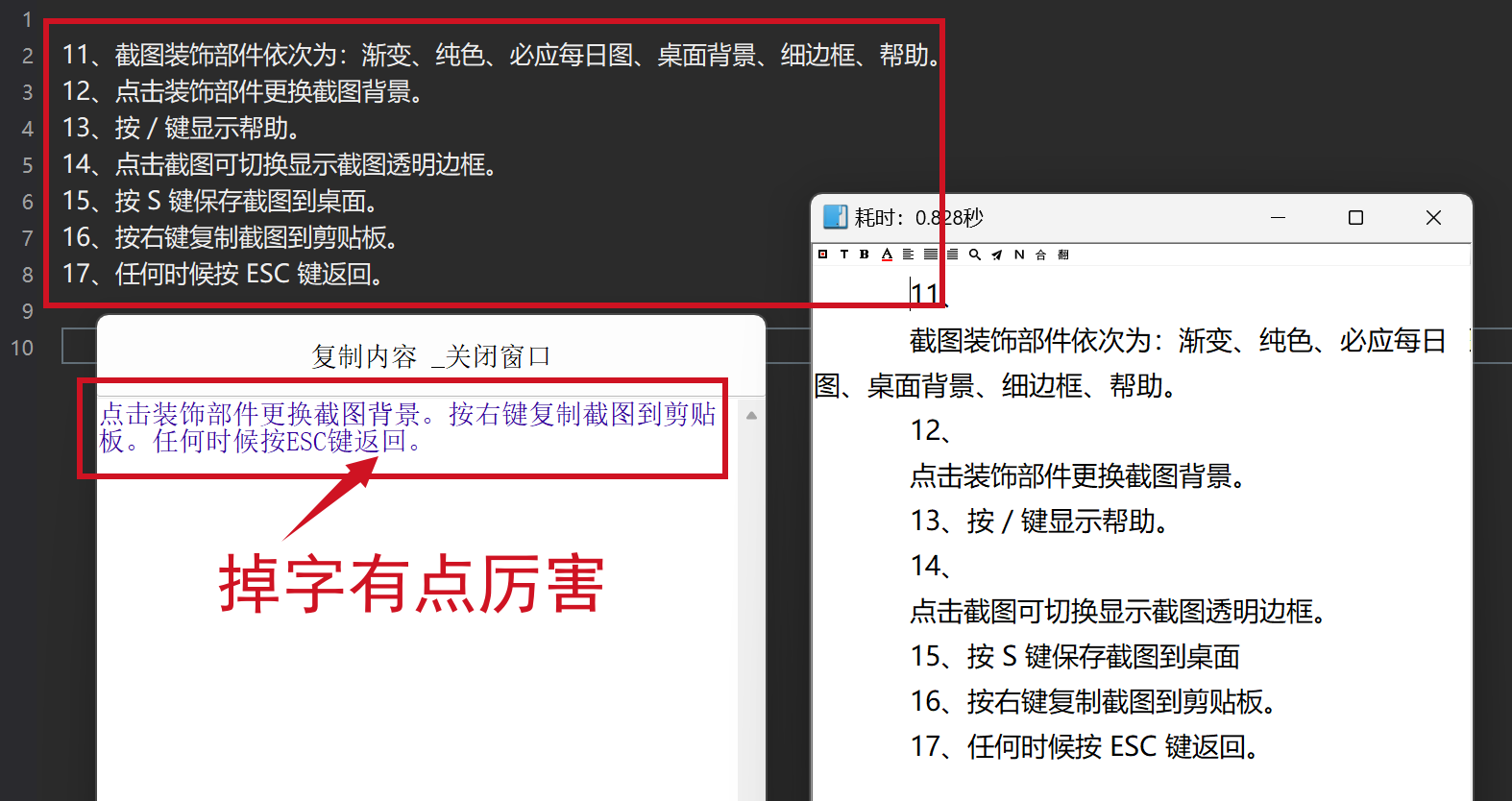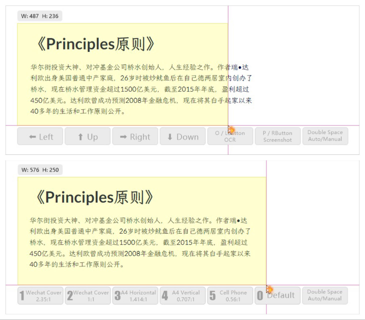 - 选区时按 o 或者左键可进行离线OCR;OCR内容会在小的编辑框中显示,供修改复制;OCR时可以自动去掉句子中间的换行。