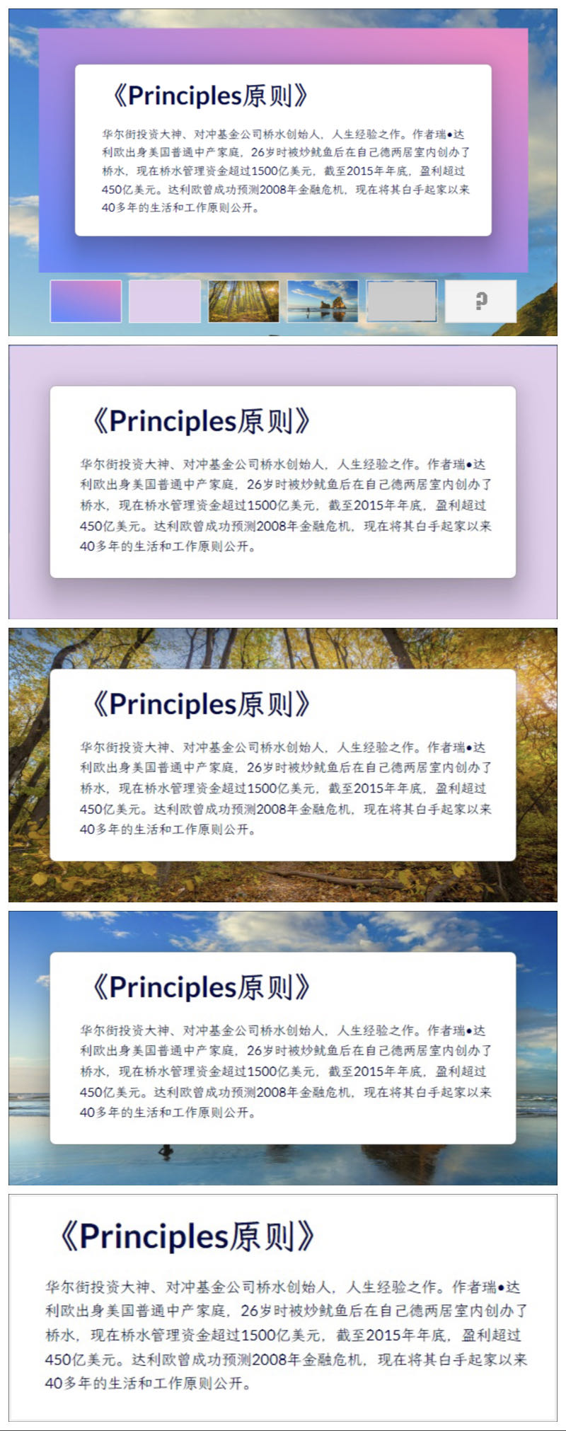 - 截图装饰部件依次为:渐变、纯色、必应每日图、桌面背景、细边框、帮助。