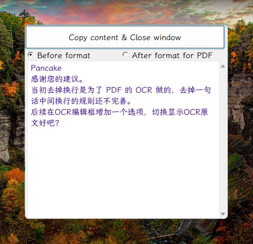 体验下来确实可以。要是OCR识别之后自动换行就更完美了,毕竟去掉换行有时会增加修改换行的工作量(全部字段挤在一起)。大佬能调回来嘛?或者可否添加自主选择是否换行的功能?