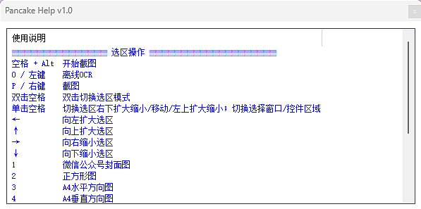 这是我自用的一个截图OCR小工具,因为我喜欢做煎饼,也喜欢吃煎饼。另外我的设想是小工具也像煎饼一样可以灵活多变,所以就叫它:Pancake。