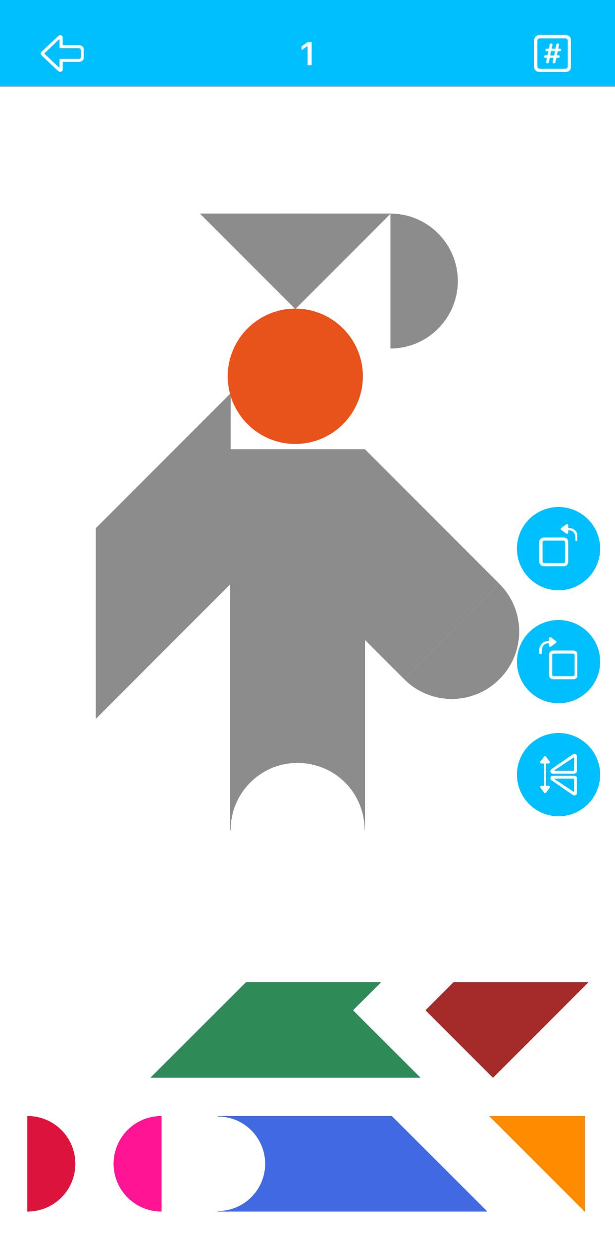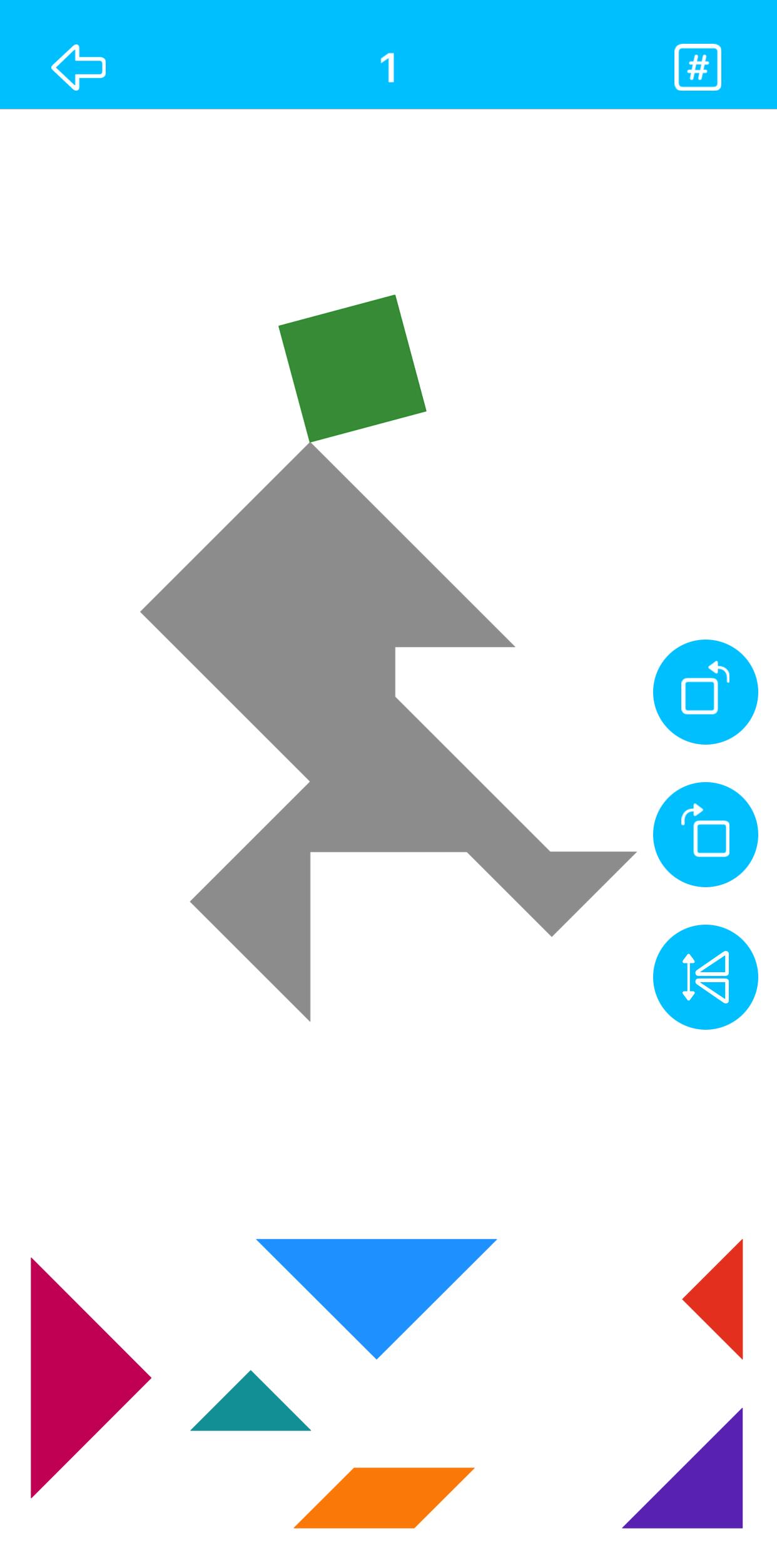 通过点击选中七巧板,然后您可以旋转、翻转或移动它。您的手指可以从屏幕上的任何位置拖动选中的七巧板。当您将七巧板移动到匹配区域附近时,匹配区将高亮显示,然后松开手指,板块将卡入匹配区!短按旋转按钮旋转15度, 长按旋转45度。