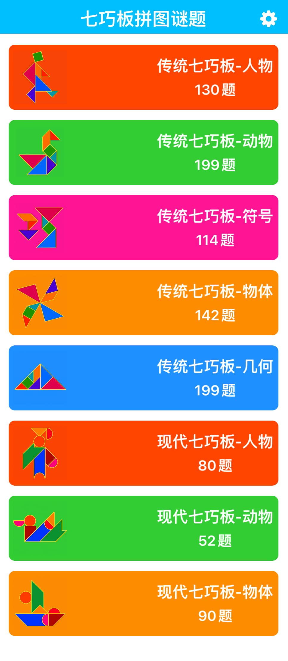 拥有最丰富,最全面的七巧板拼图谜题:1000+ 谜题!既有传统七巧板谜题 (多边形), 也有现代智力七巧板谜题 (多边形和圆形)。