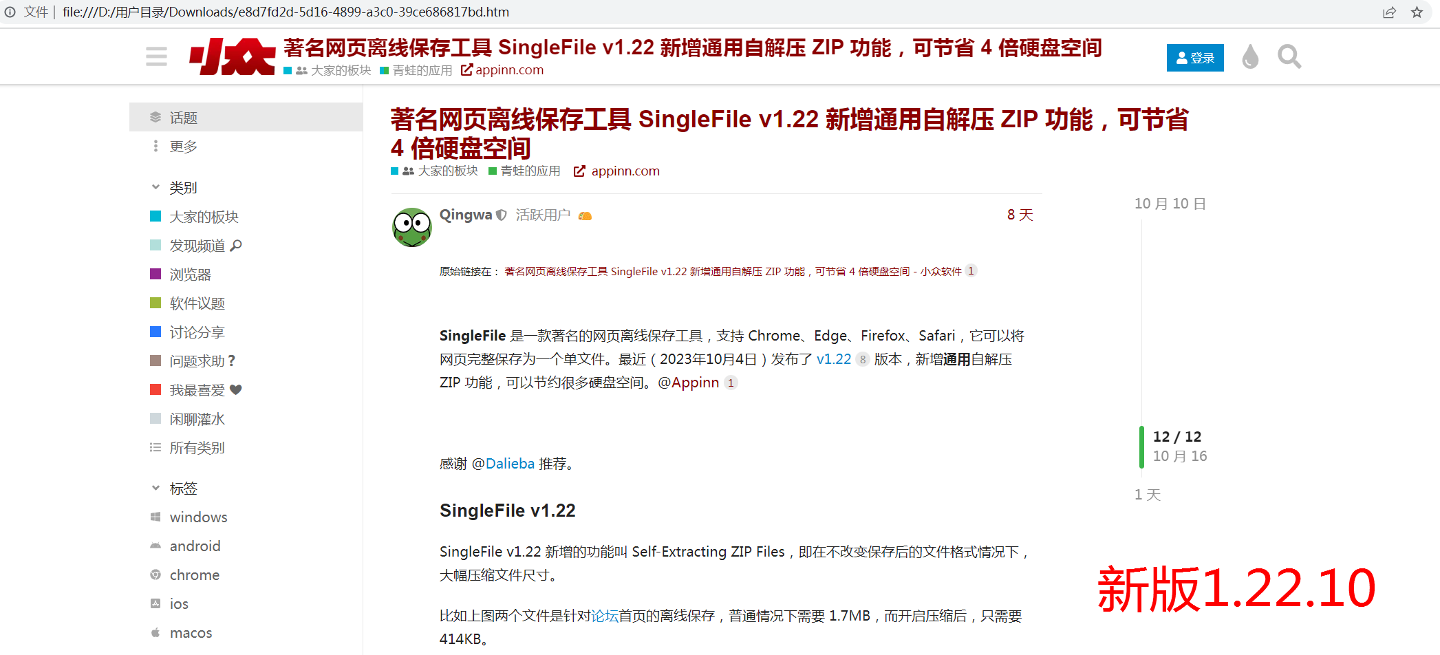 SingleFile 是一款著名的网页离线保存工具,支持 Chrome、Edge、Firefox、Safari,它可以将网页完整保存为一个单文件。最近(2023年10月4日)发布了 v1.22 版本,新增通用自解压 ZIP 功能,可以节约很多硬盘空间。@Appinn