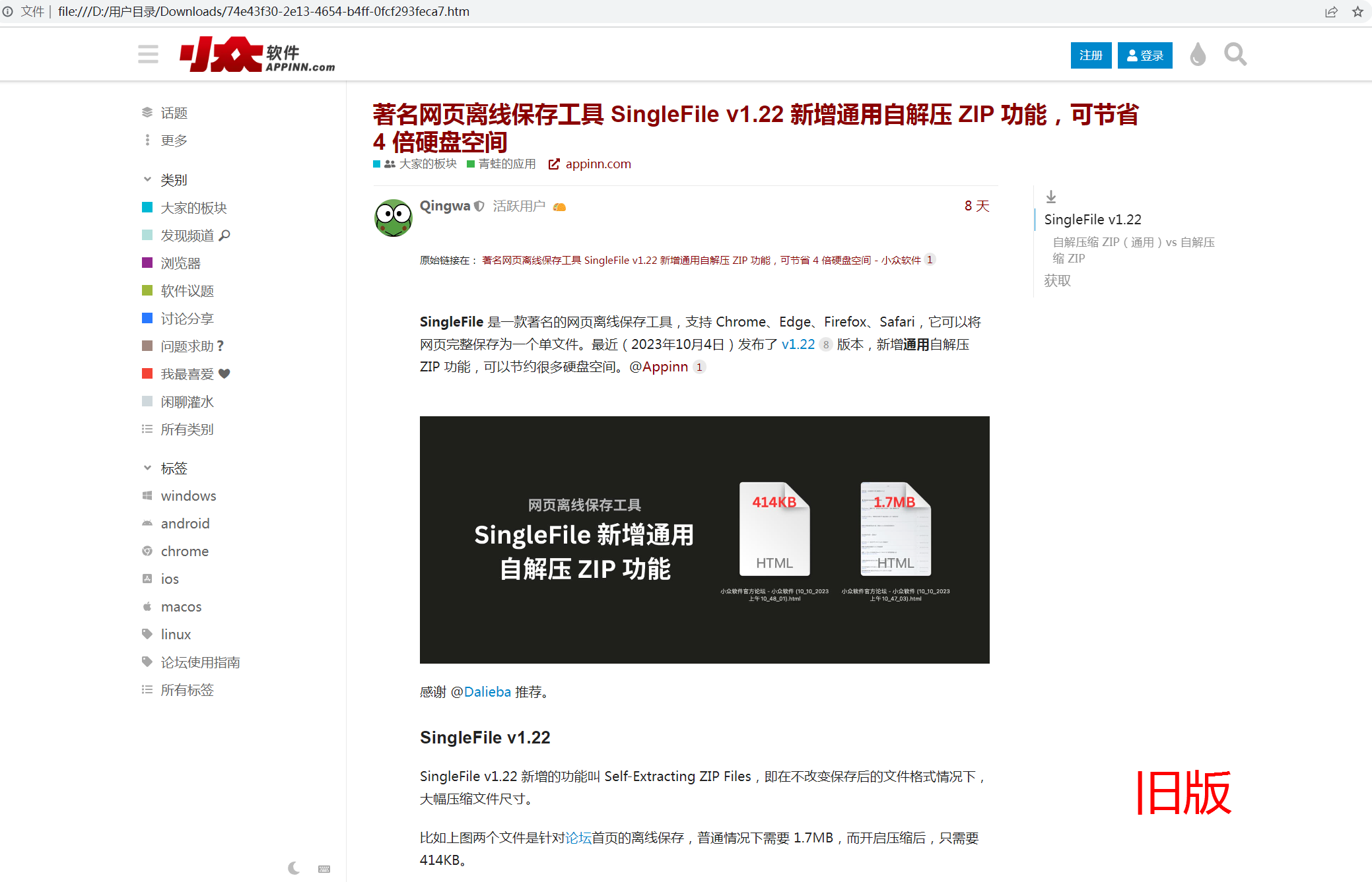 原始链接在: 著名网页离线保存工具 SingleFile v1.22 新增通用自解压 ZIP 功能,可节省 4 倍硬盘空间 - 小众软件