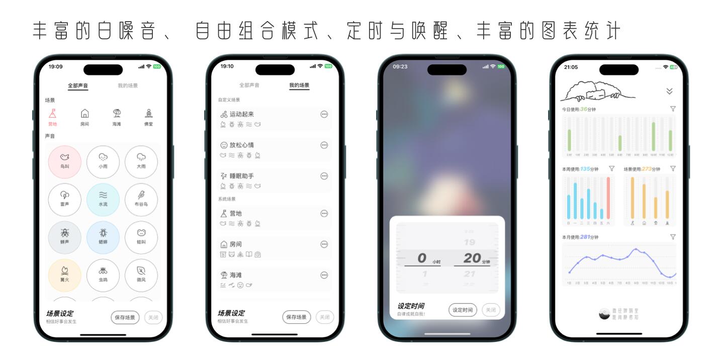 丰富声音:超过30种纯净的白噪音,让您可以随心所欲地进行组合,打造专属的听觉风景。
