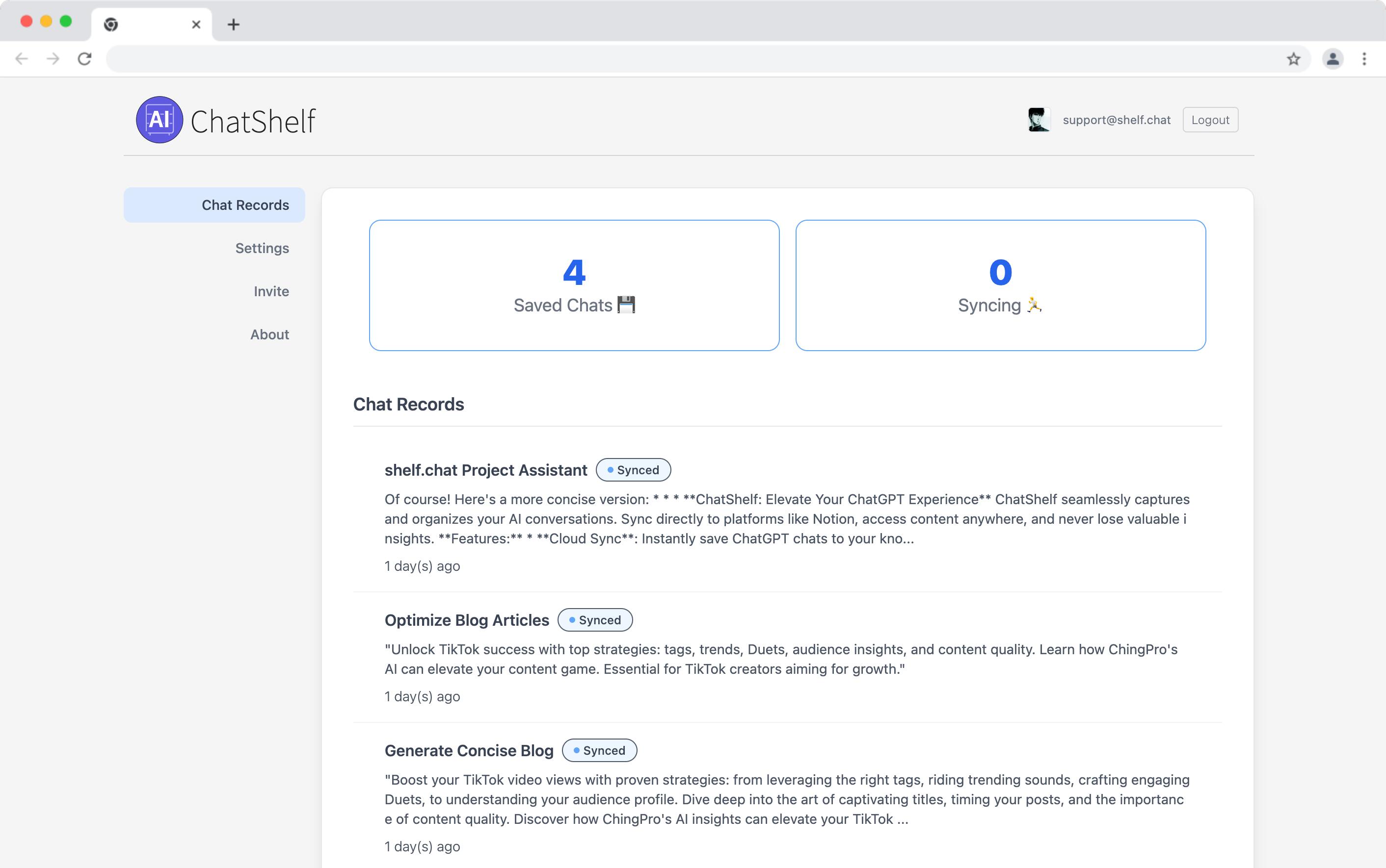 历史记录:再也不会丢失ChatGPT的对话。ChatShelf存档每次对话。