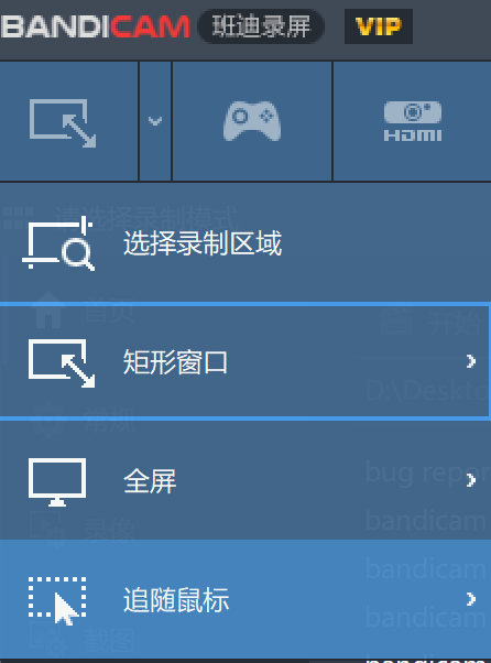 在bandicam的矩形窗口虽然可以拖拽进行移动, 但不如我设想的按下某键后自动追随鼠标来的自然, 鼠标不会在录制中频繁的消失.