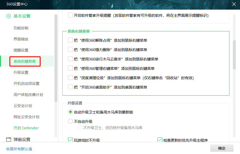 把这些设置都看一看,管一管,基本上能做到和火绒一样的静默效果。