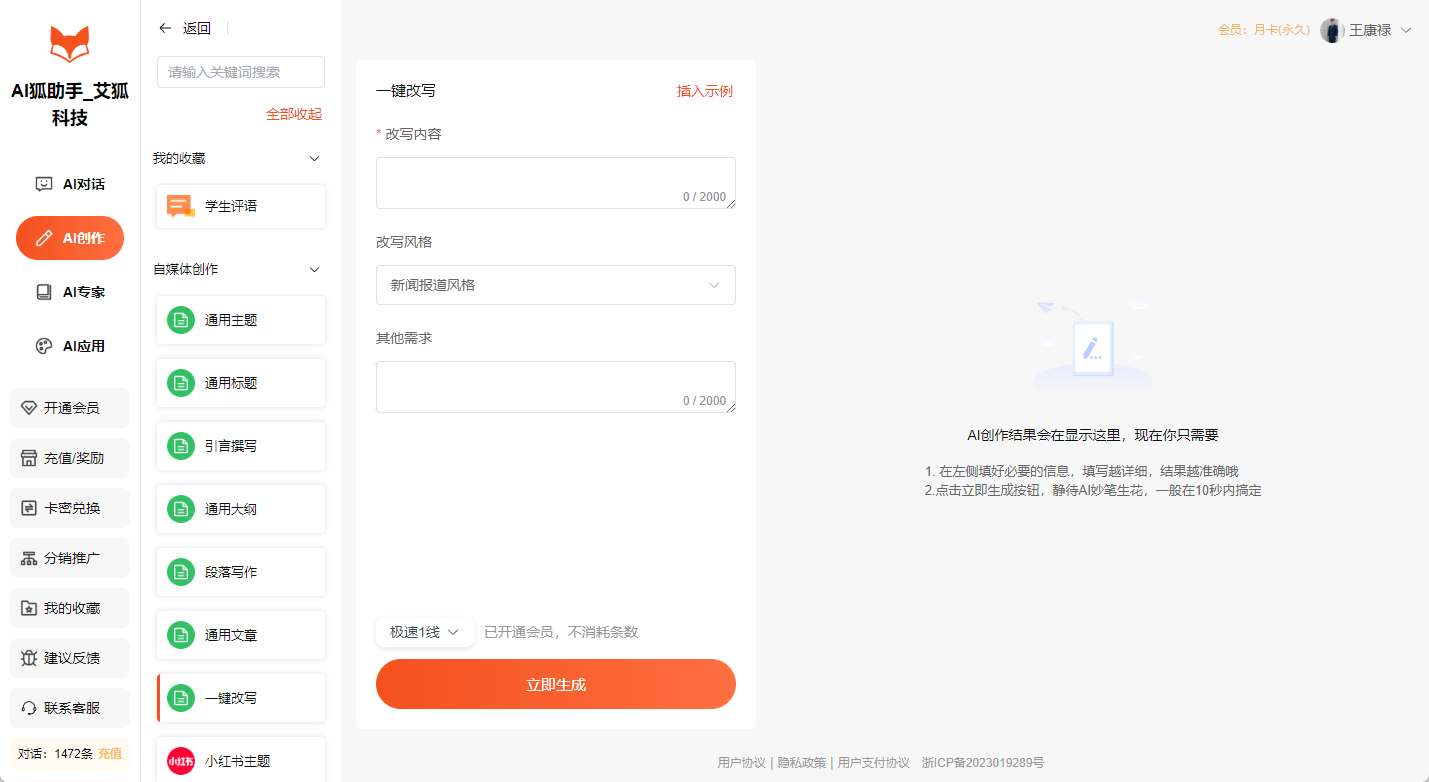 无论是需要一篇文章来辅助写作还是需要一首诗来表达情感,AI创作模块都能够满足你的需求。