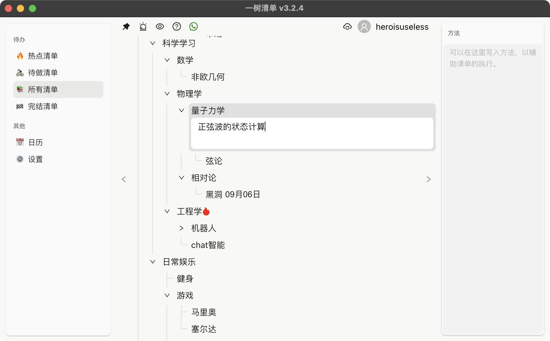 「树清单」特别适用于管理大量的清单待办,适用于有大量计划的人,我本身也是有这个痛点,我有很多想做的事情,计划中套着子计划,用普通列表很难合理归类这些计划,而用树状列表的话就非常完美了。