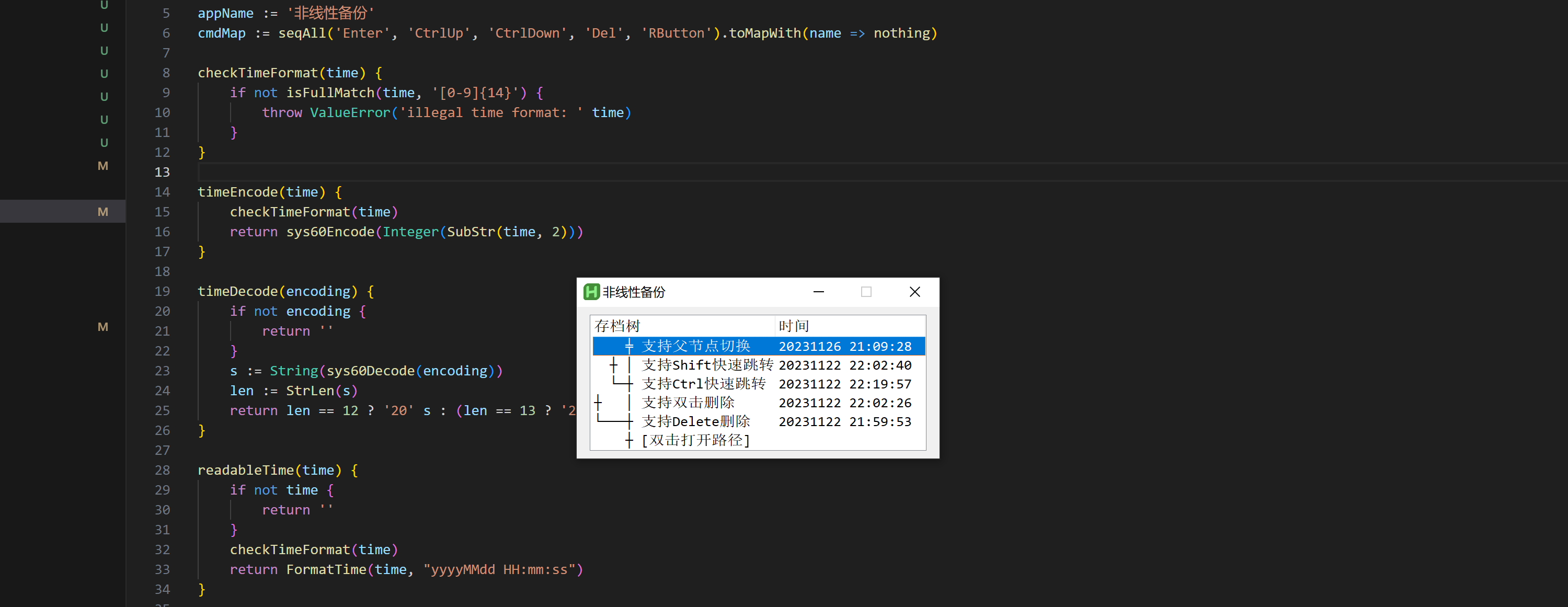项目用纯AutoHotKey v2编写,发布在Gitee上:一个大小为1.2M的桌面应用程序,提供非线性的游戏存档管理乃至工作文件管理。
