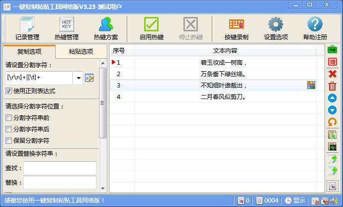 1、主窗口:用于实时显示热键操作或文本文件导入后, 记录列表中的文本内容。 同时,通过复制粘贴选项,可以对操作的文本进行自动分割、大小写转换、查找替换和自动按键等操作。
