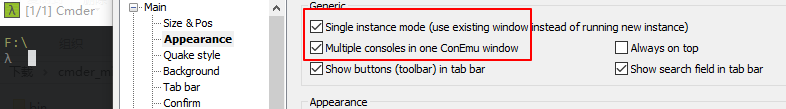 为什么Cmder在不同文件夹下“右键”启动时,标签Tab只有一个,不出现不同的文件夹下的cmd呢? 如下图,我已经设置“在一个窗口下出现不同会话的cmd标签”,但是在不同文件夹下“右键”启动cmder时,还是只有一个标签,不会出现几个不同标签。 但是我设置“在多个窗口下出现不同会话的cmd标签”时,在不同文件夹下“右键”启动cmder,出现的的就是不同文件夹的cmd窗口。