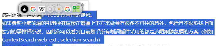 如果參照小衆論壇的引用標簽這樣在選區上下方來做會有很多不可控的意外,包括且不限於我上面提到的竪排輕小説,因此你可以看到目前幾乎所有劃詞插件采用的都是這類跟隨鼠標的方案(例如 ContextSearch web-ext , selection search)