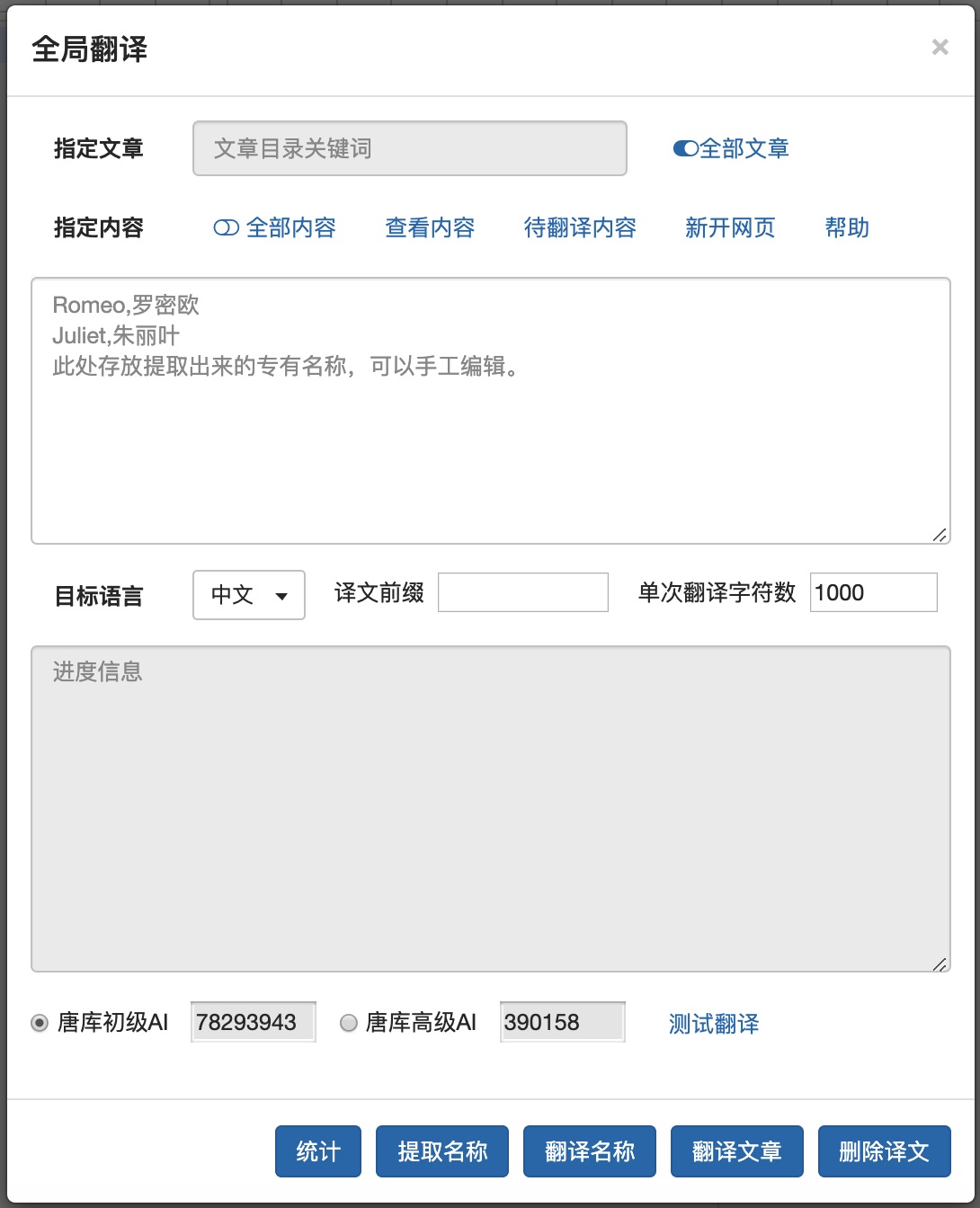目前AI做不到一次调用翻译整本书,多次调用产生人名地名翻译不一致问题。唐库通过名称提取解决了该问题。