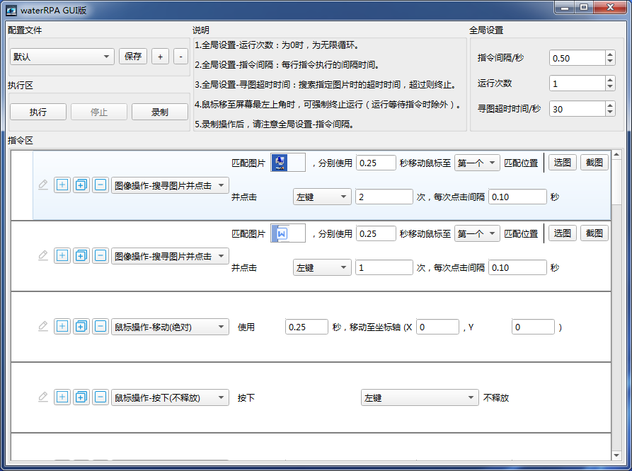 使用说明:添加指令,下拉框选择或复制或录制可拖动,如果“执行”按钮为灰色则说明有指令不规范无法执行