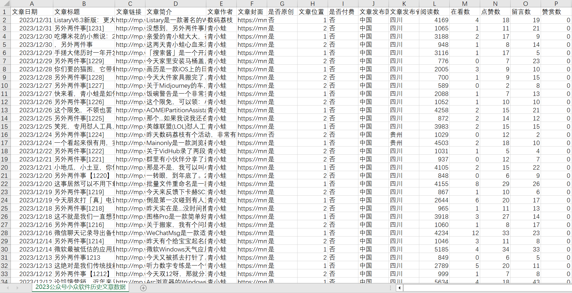 导出的文章数据excel包含文章日期,文章标题,文章链接,文章简介,文章作者,文章封面图,是否原创,IP归属地,阅读数,在看数,点赞数,留言数,赞赏次数等,从数据可以看出头条341篇,次条103篇,几乎是日更,看文章作者几乎都是青小蛙,貌似就一个人在写公众号,发布地只有四川和贵州,作者老家应该在贵州,在四川工作。
