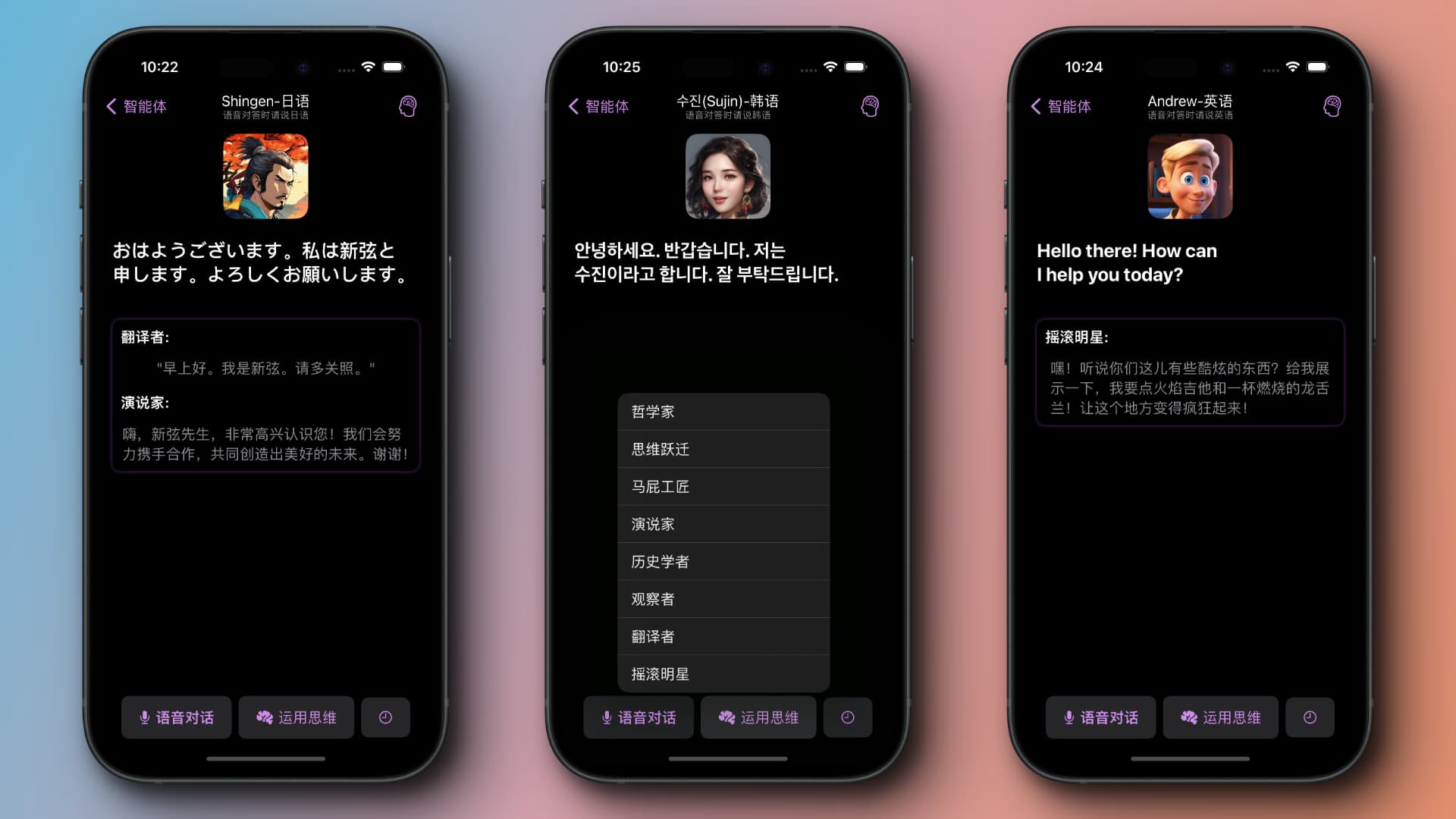 当用户打开与智能体的对话框时,智能体会主动发起语音对话,这种设定可以让用户迅速进入一段对话。用户目前只可以通过语音的方式回答智能体的对话,这种强设定也是为了约束用户一定要练习口语能力。当用户不理解智能体的回复或问题的含义又或者无法继续聊天,这是时候可以运用思维来解决这个问题。这是我们App最核心模块,思维列表内置了8种(后续会更多)思维人格,你可以简单的把他们理解为脑中的小人。他们分别是:哲学家,思维跃迁,马屁工匠,演说家,历史学家,观察者,翻译者,摇滚明星。 每当用户点击一个思维,此思维就会结合思维人格来回答智能体的问题,为用户制造出一些话题效果或者产生新的动机