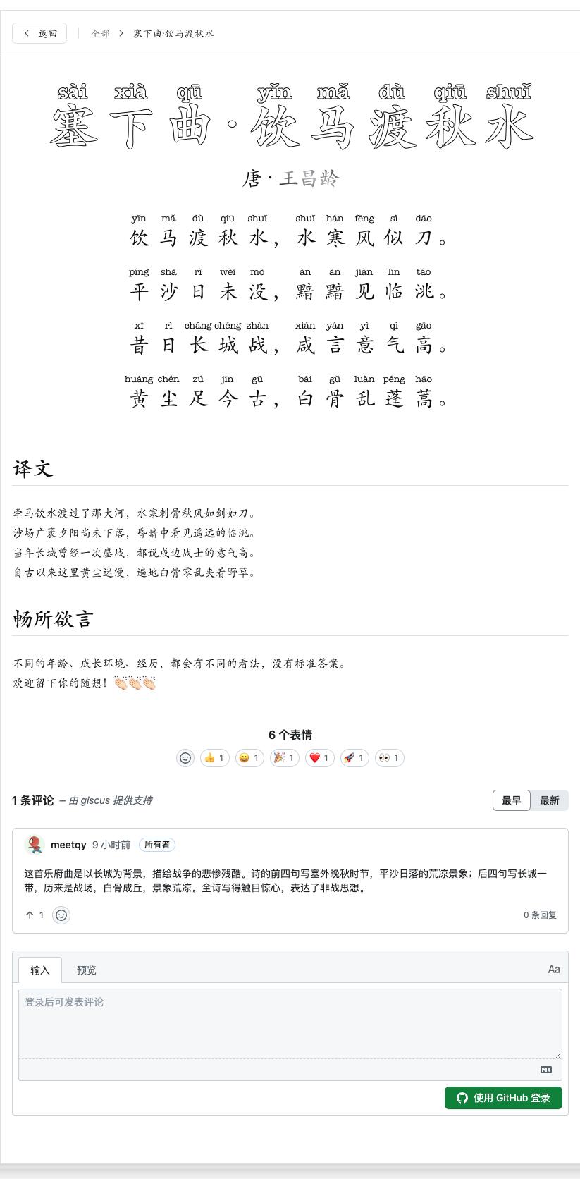 网站看着不错,不过有些注音可能需要考证一下。比如您截图中的“饮马渡秋水”,“饮马”的“饮”一般读四声(yìn),您的截图中标的是三声。