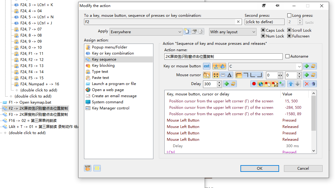 需要大佬帮我写一个小脚本,主要功能为:在第一次鼠标左键点击的位置,开启选中文字状态(模拟鼠标左键按下),之后可以移动鼠标选中文字,到结束位置处再次点击鼠标左键结束选中文字状态。这时候弹出复制,重新选择两个下拉选项,如果选择复制选项,就把选中的文字复制到剪切板并退出选中文字状态。如果选择重新选择选项,就重复上面的选中文字流程。
