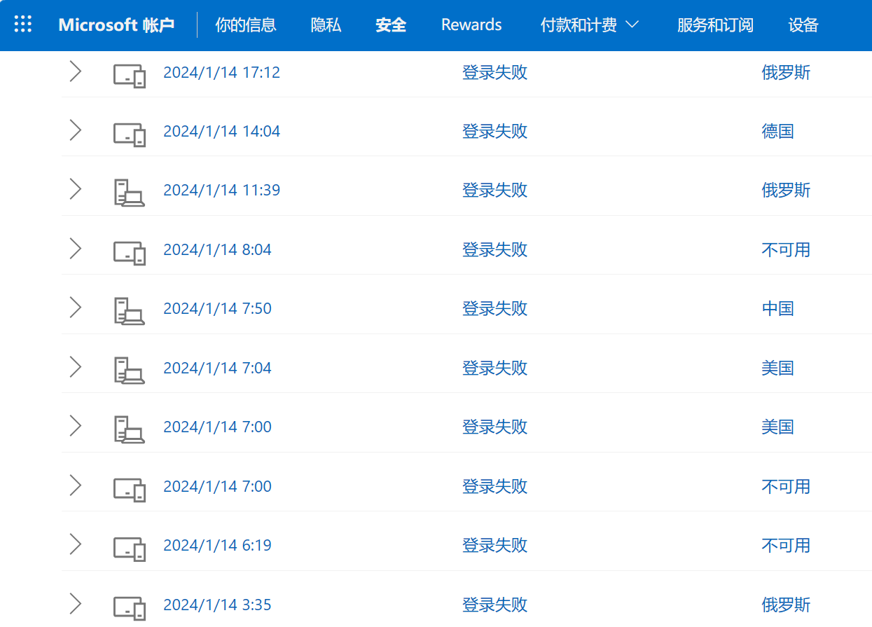 补充2:又发现一个问题,我的两个邮箱均有hotmail.com和outlook.com两个域名,但是两个邮箱所有的异常登陆尝试都是使用hotmail域名,我一直使用的都是outlook域名,从来没有在网上留过hotmail