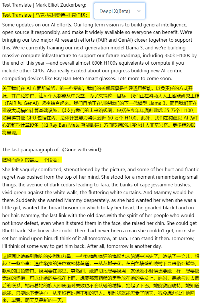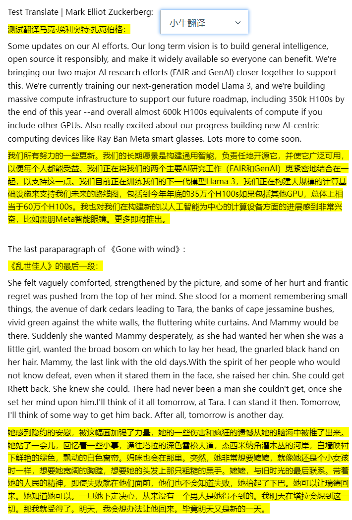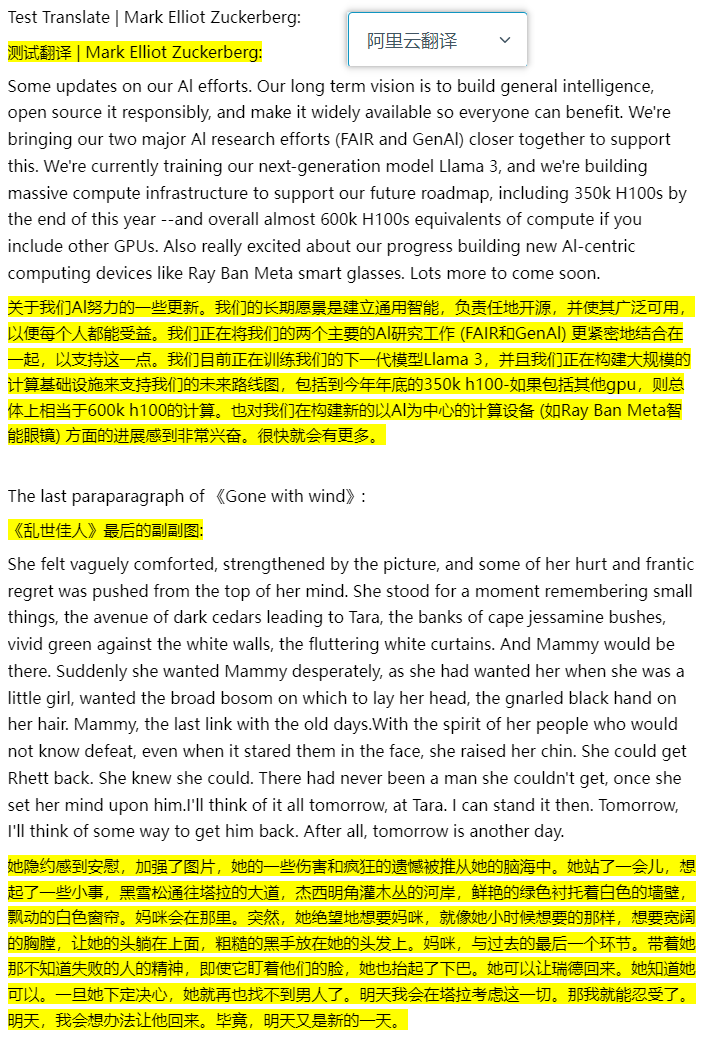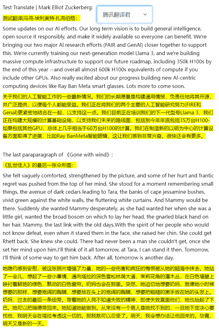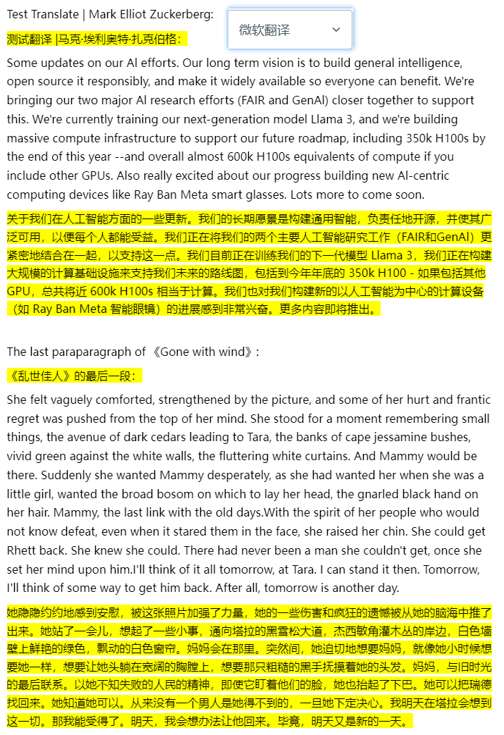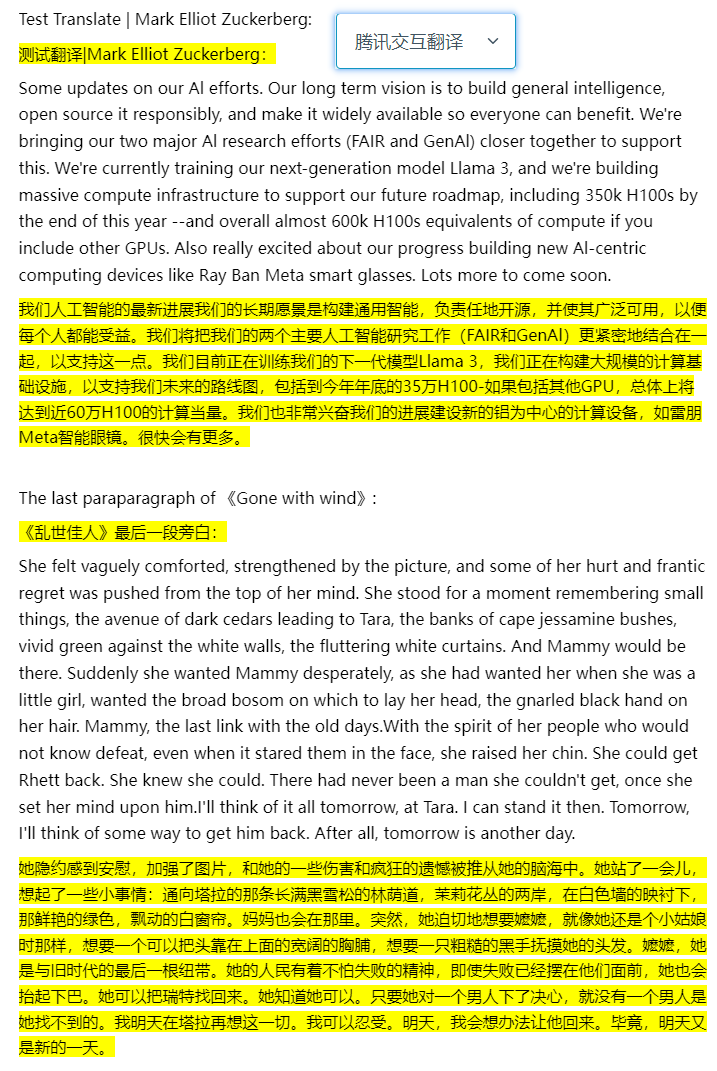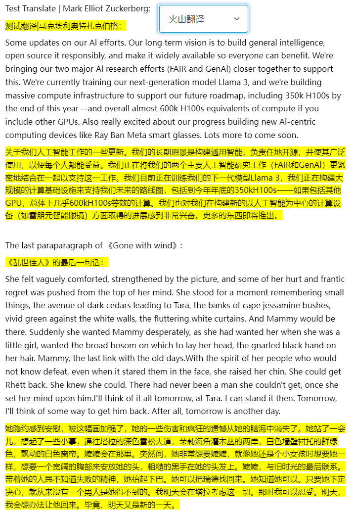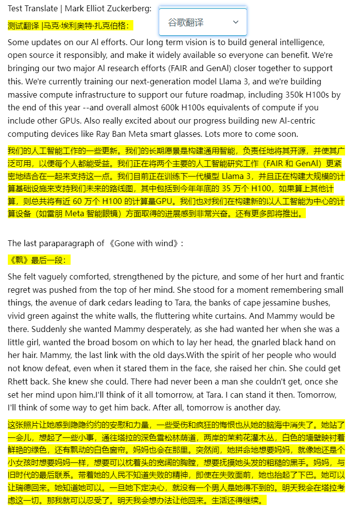 随机找了一段扎克伯格今天发的推和小说《飘》的最后一段,发布到知乎上,对比一下效果