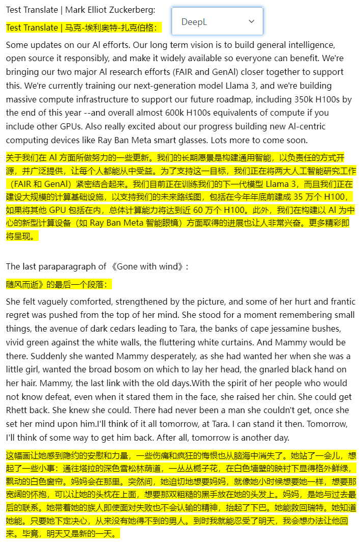 我个人的感受是:在英译中领域,这几家并没相差很多,细节上国产的几个比不过外国的。谷歌翻译居然效果不如DeepL和微软翻译,DeepL翻译小说略流畅点。Open AI似乎并没有比别家好,但它会自动识别出人名并保持不翻译人名,我在想这个特性会不会用在翻译那种片假名很多的日本轻小说会比较好?