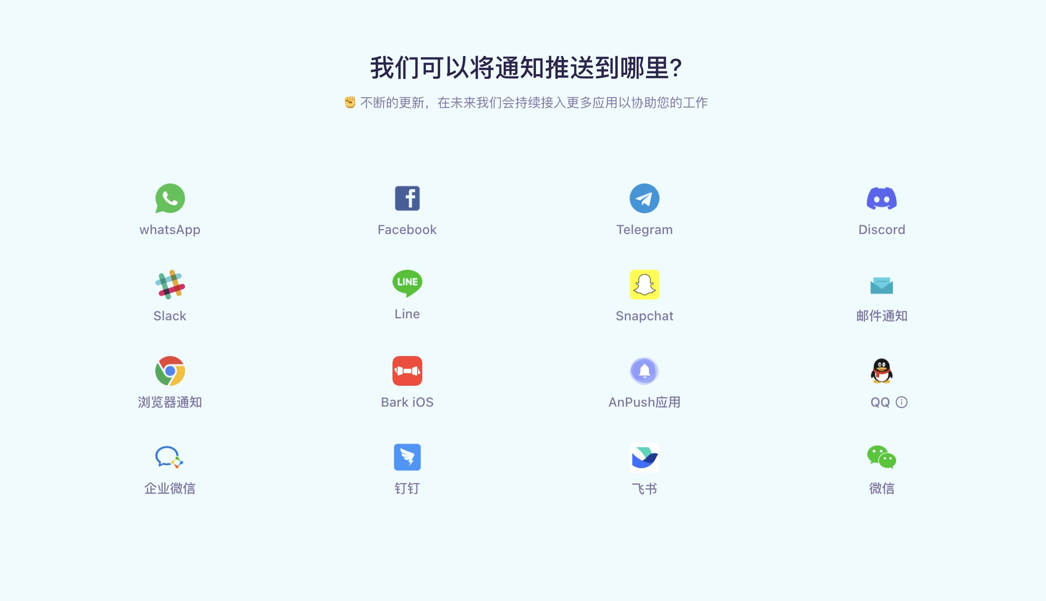 AnPush是集成了微信、钉钉、飞书、微信测试号、企业微信、邮件、Slack、Telegram、Discord等十几个应用的消息推送平台。 您只需要调用一次接口,即可将消息推送至这些应用!发挥创造力,用AnPush来增强你的应用