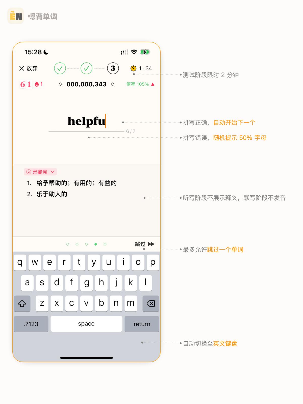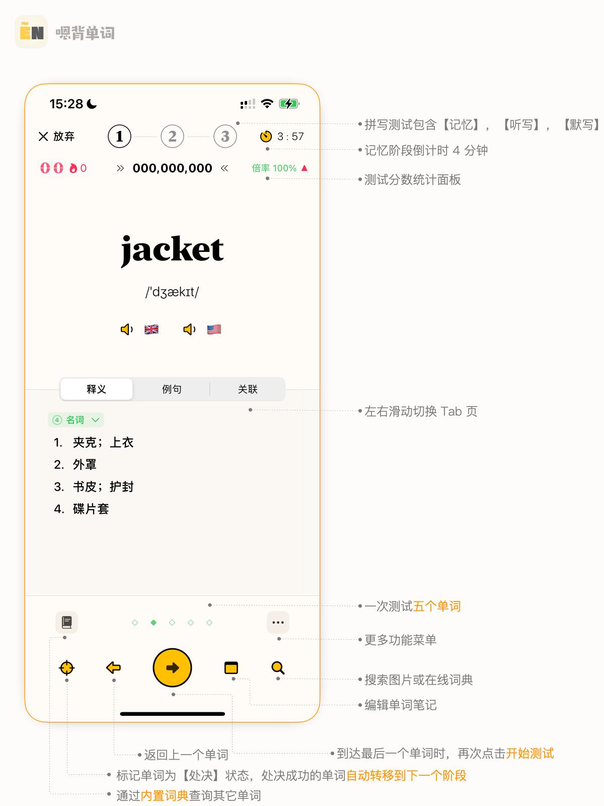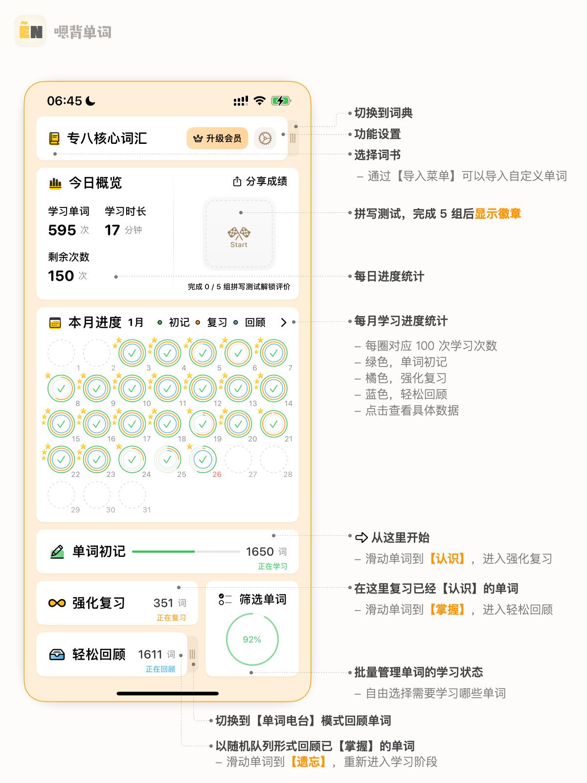 新免费模式对于每本词书每天提供 150 次学习次数,无论是拼写,初记,复习还是回顾都可以自由选择,点击下一个单词(或拼写一次)就算消耗一次学习次数
