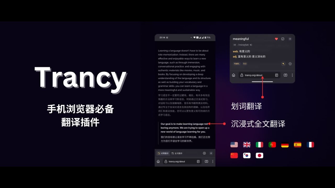 Trancy 针对桌面浏览器进行了迭代和兼容,并专门开发了移动端浏览器插件。经过深度试用后,可以说这是手机浏览器必备的插件,强烈推荐使用。