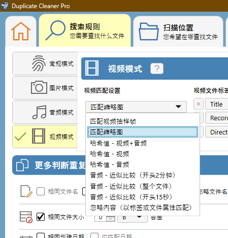 Duplicate Cleaner Pro 支持对视频根据图像抽帧、缩略图以及音频查重,对音频支持元数据查重以及相似度查重,查找到重复文件还有高度自定义的批量选择功能,对于选择的文件有删除、移动、硬链接替换等处理方法,是我用过功能最强大的查重工具,就是要收费。